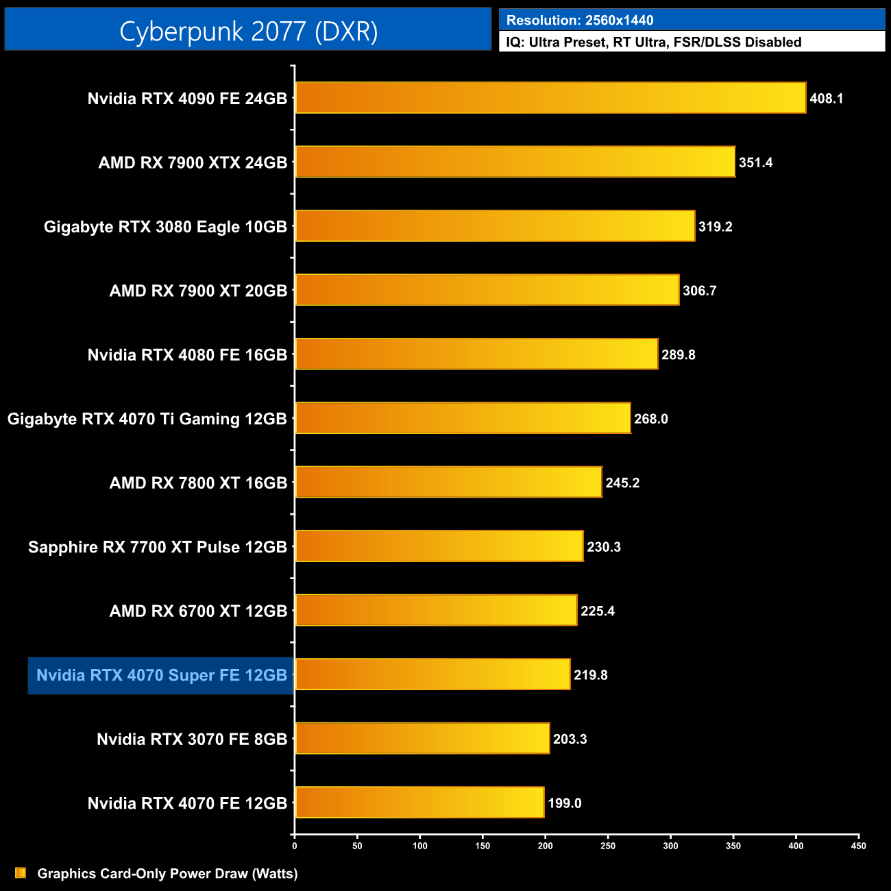Stepping up to 1440p, we do see average power draw increase at this resolution, with a new figure of 210.6W. That's still below the 220W TGP, and marks an increase of about 17W compared to the vanilla RTX 4070. Some games do draw more than this, such as Alan Wake II and Cyberpunk 2077 as you can see above, but plenty of games saw power draw below 200W.