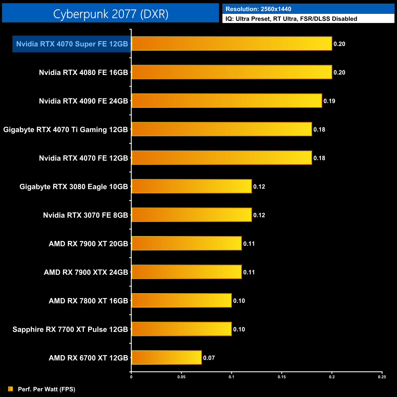 It's also fair to point out that the RX 7800 XT remains a viable option for those only interested in bang per buck, with the RDNA 3 GPU still offering the best cost per frame for rasterised 1440p gaming, and of course it does offer that extra 4GB VRAM. Many may now be swayed by the 4070 Super however, considering it is faster outright, significantly so when it comes to ray tracing performance, while also offering support for its superior DLSS upscaling technology, alongside increased efficiency.