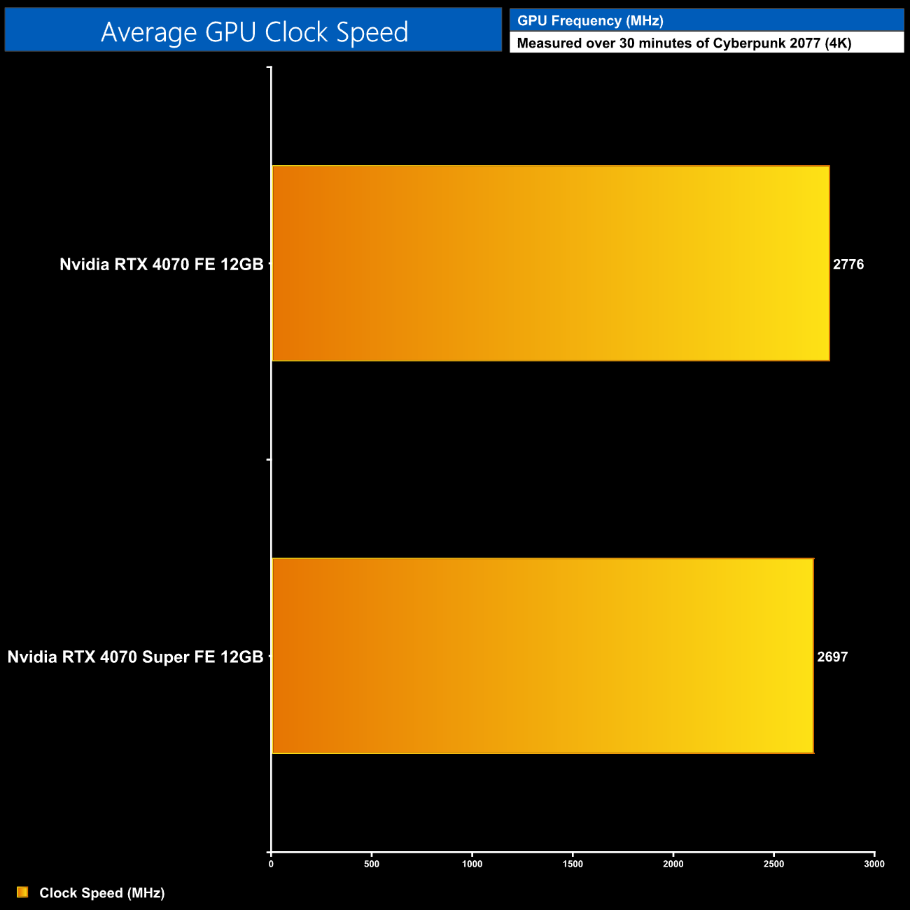 Here we present the average clock speed for each graphics card while running Cyberpunk 2077 for 30 minutes. We use GPU-Z to record the GPU core frequency during gameplay. We calculate the average core frequency during the 30 minute run to present here.