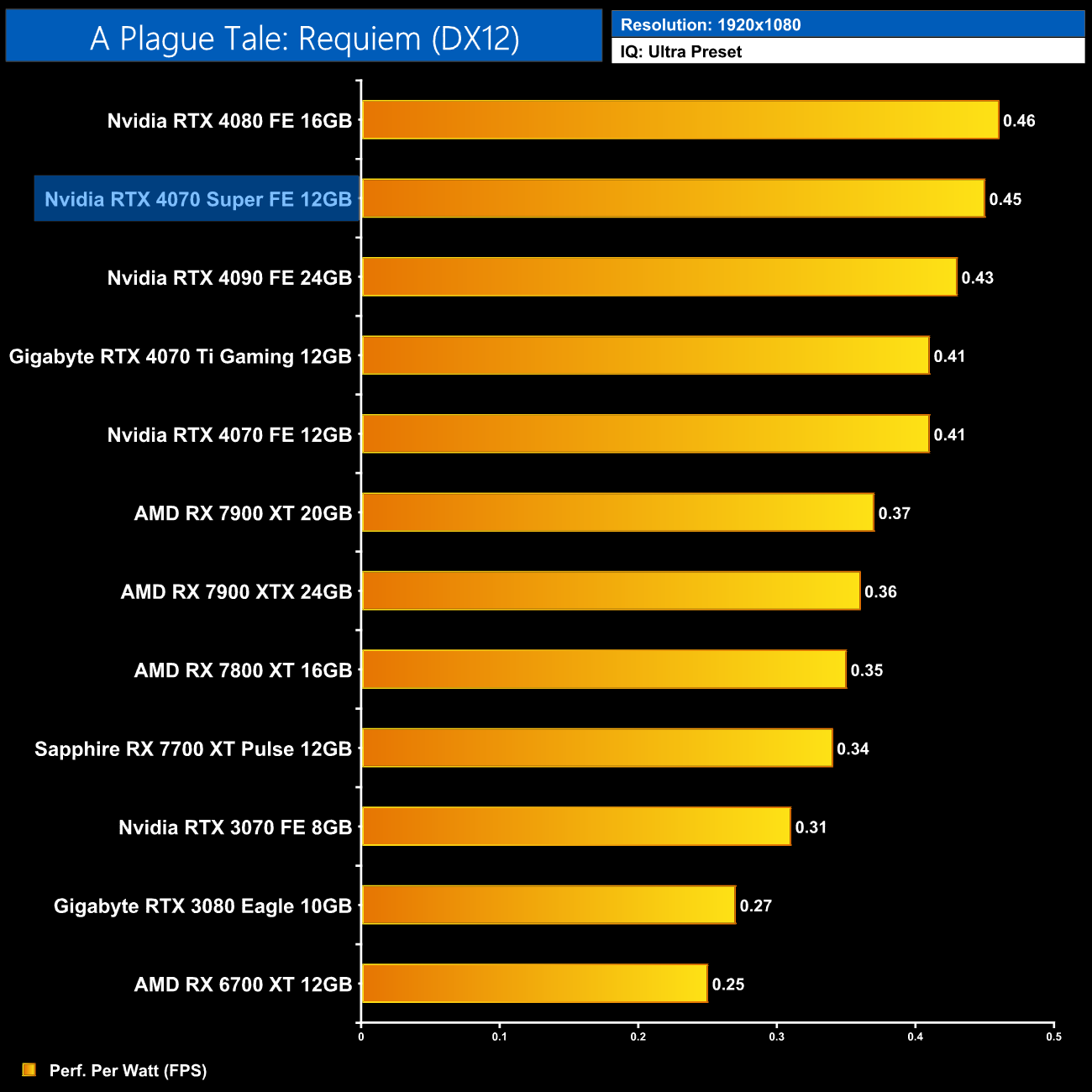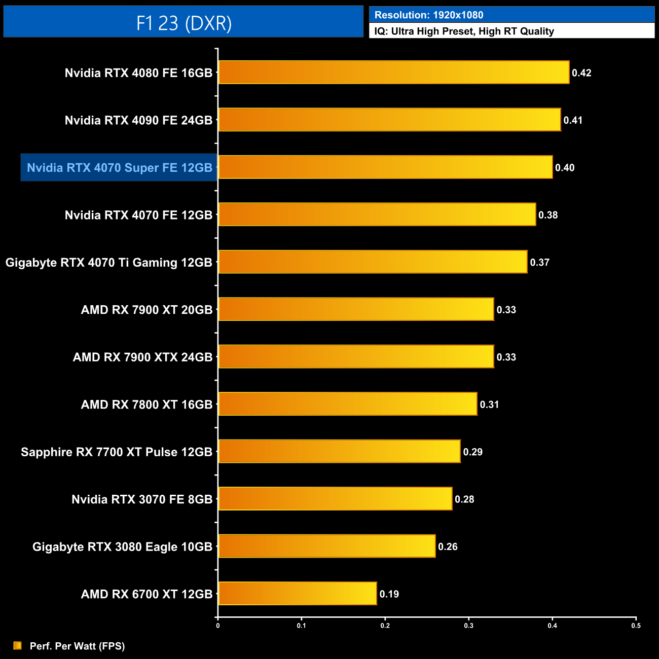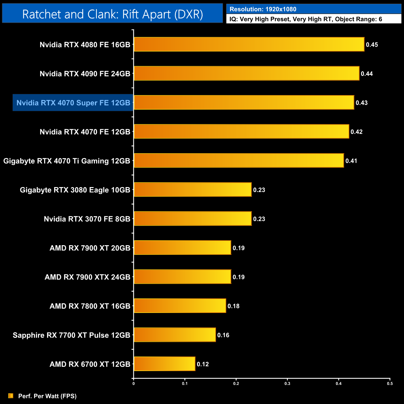 The low power draw figures coupled with the performance improvements on offer over the vanilla RTX 4070 does make the 4070 Super that bit more efficient, second only to the RTX 4080 in our chart.