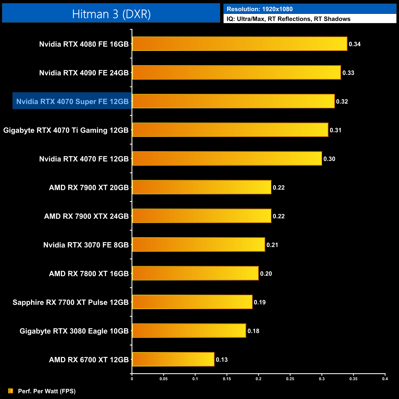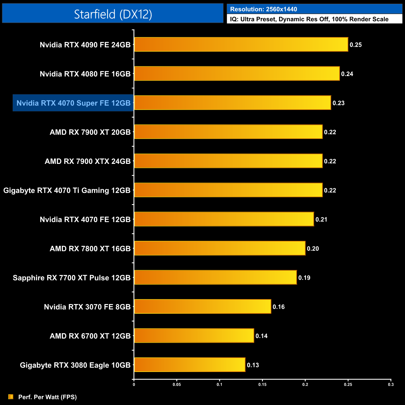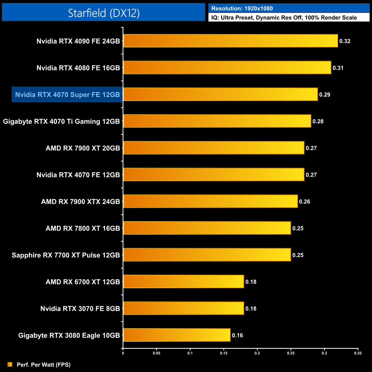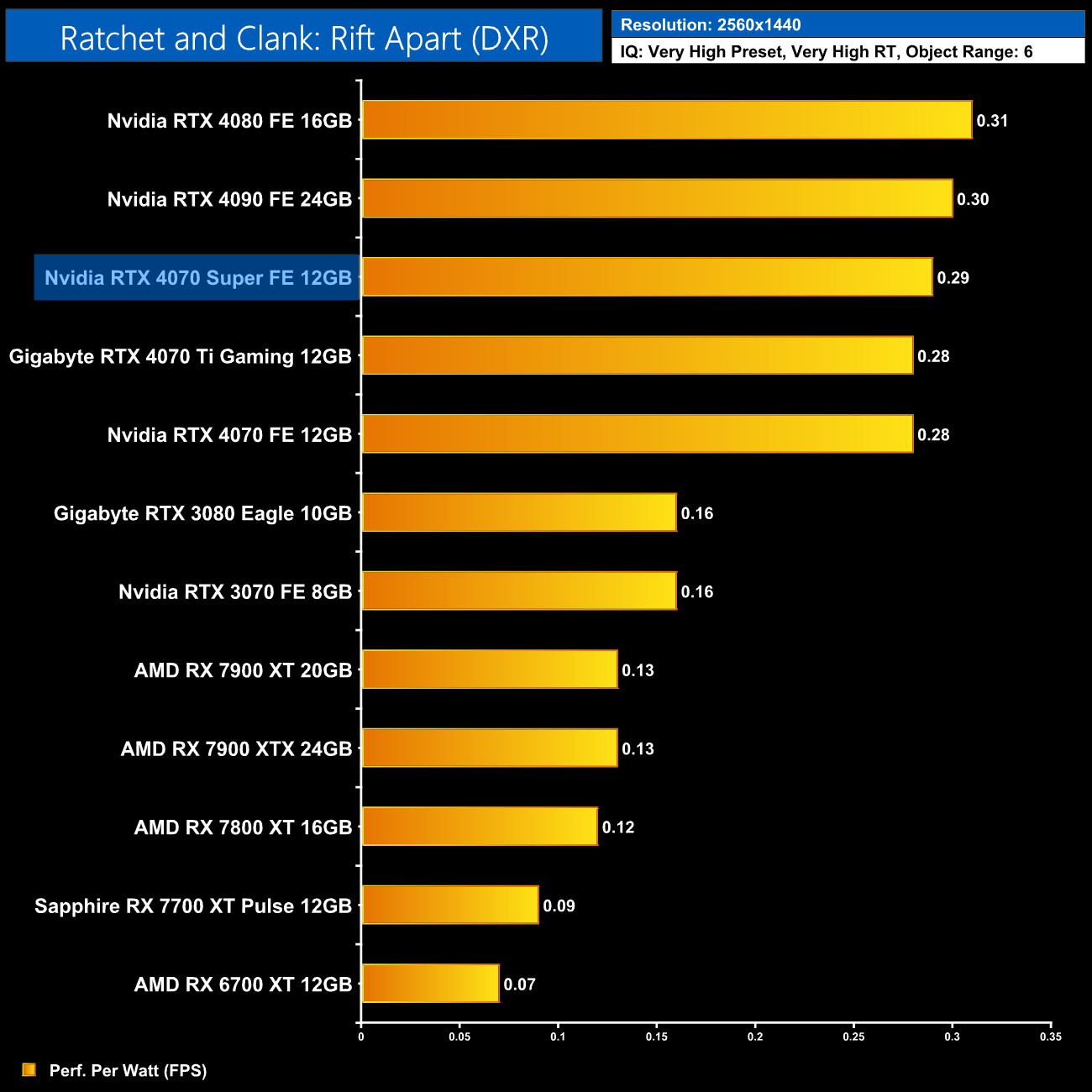 The low power draw figures coupled with the performance improvements on offer over the vanilla RTX 4070 does make the 4070 Super that bit more efficient, second only to the RTX 4080 in our chart.