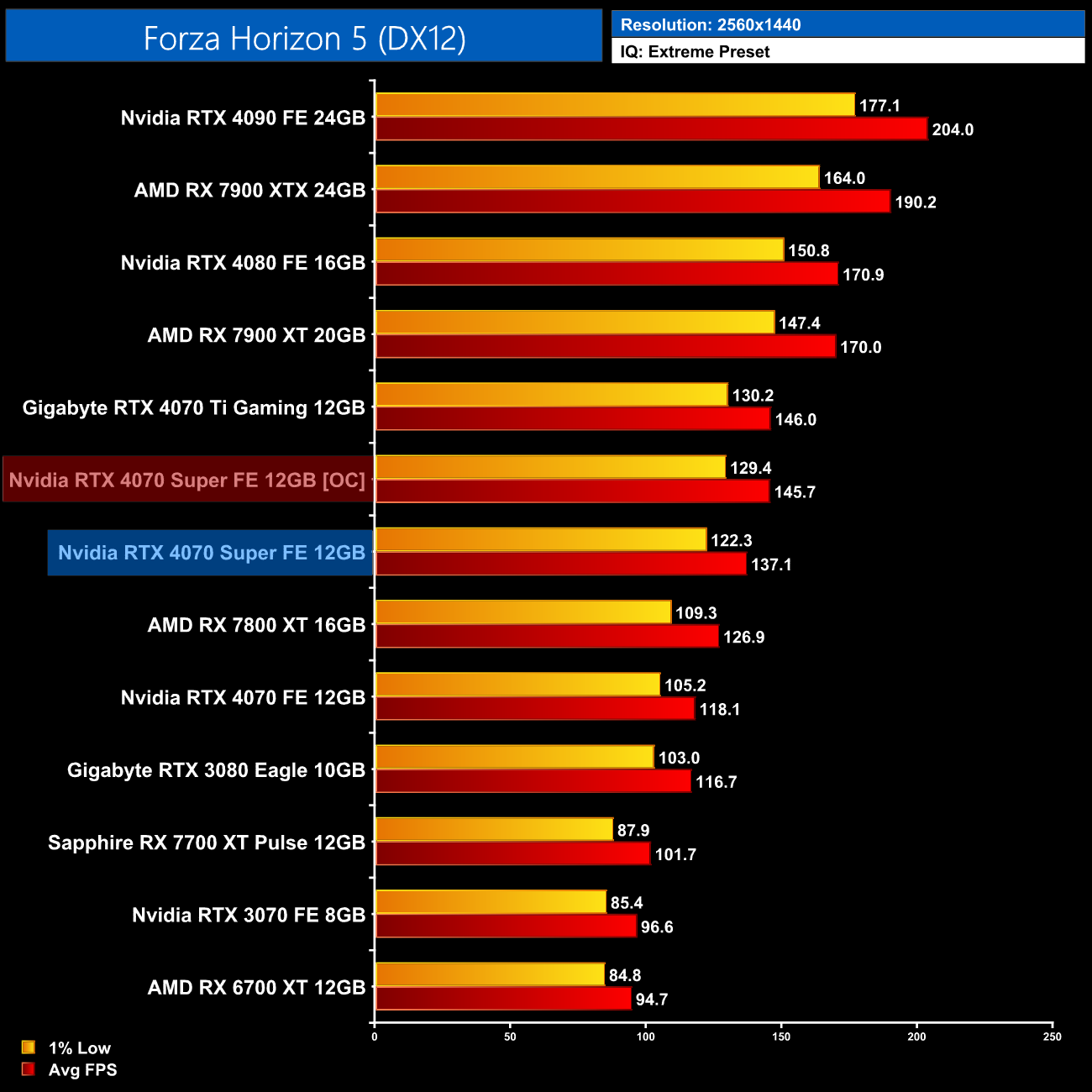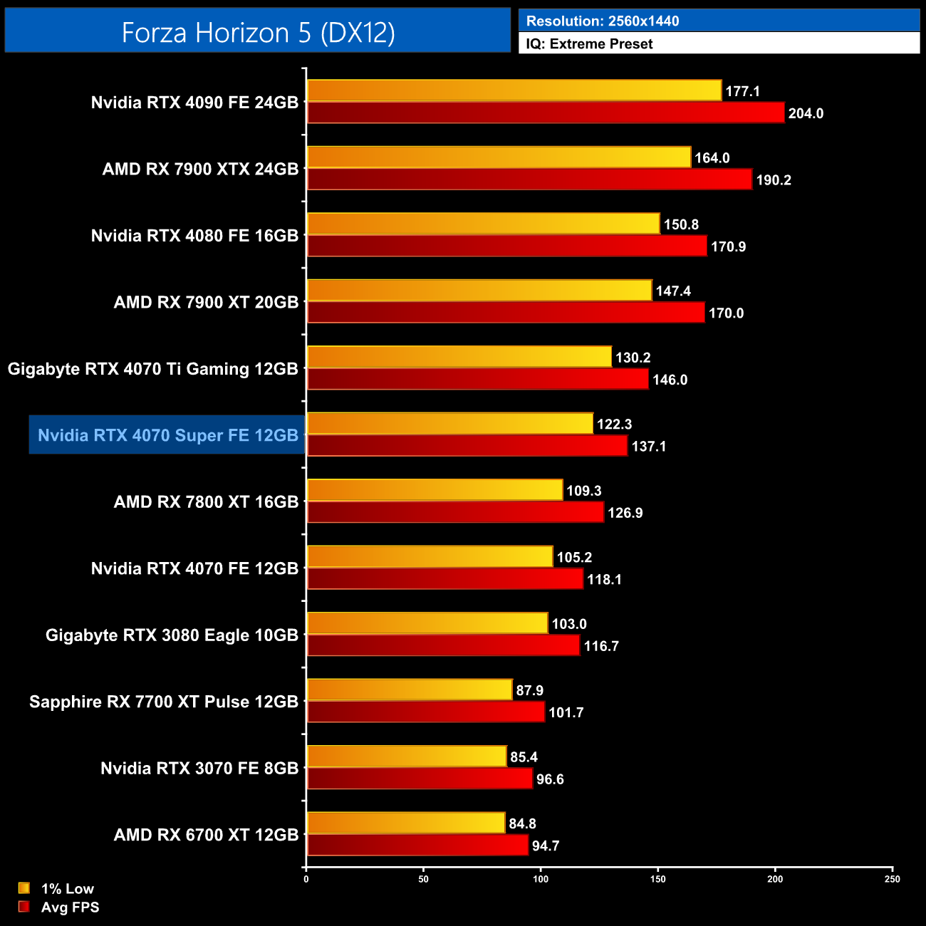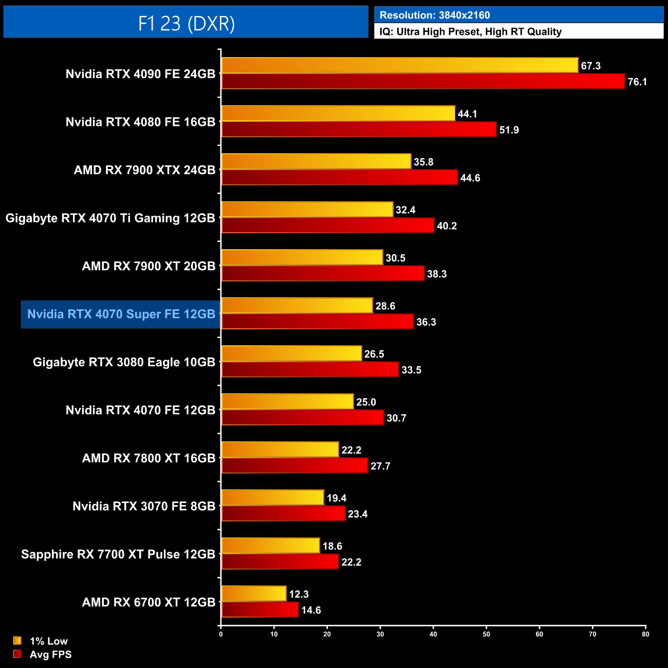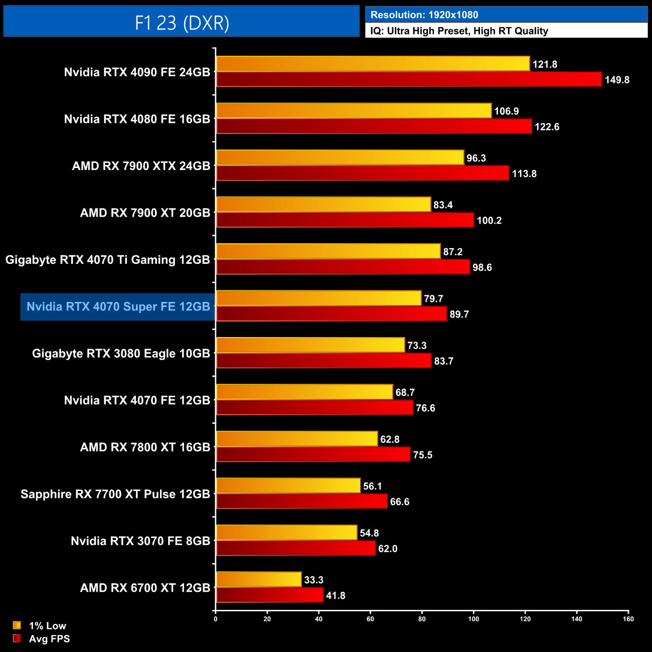 F1 23 is more competitive for AMD GPUs, but even then we are looking at the 4070 Super coming in 25% faster than the 7800 XT at 1440p, while it's only 8% behind the RX 7900 XT. Versus the 4070 Ti, it's 9% slower here.