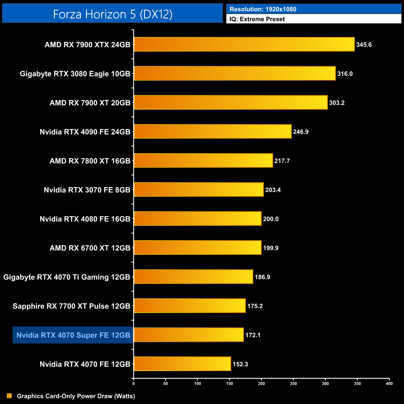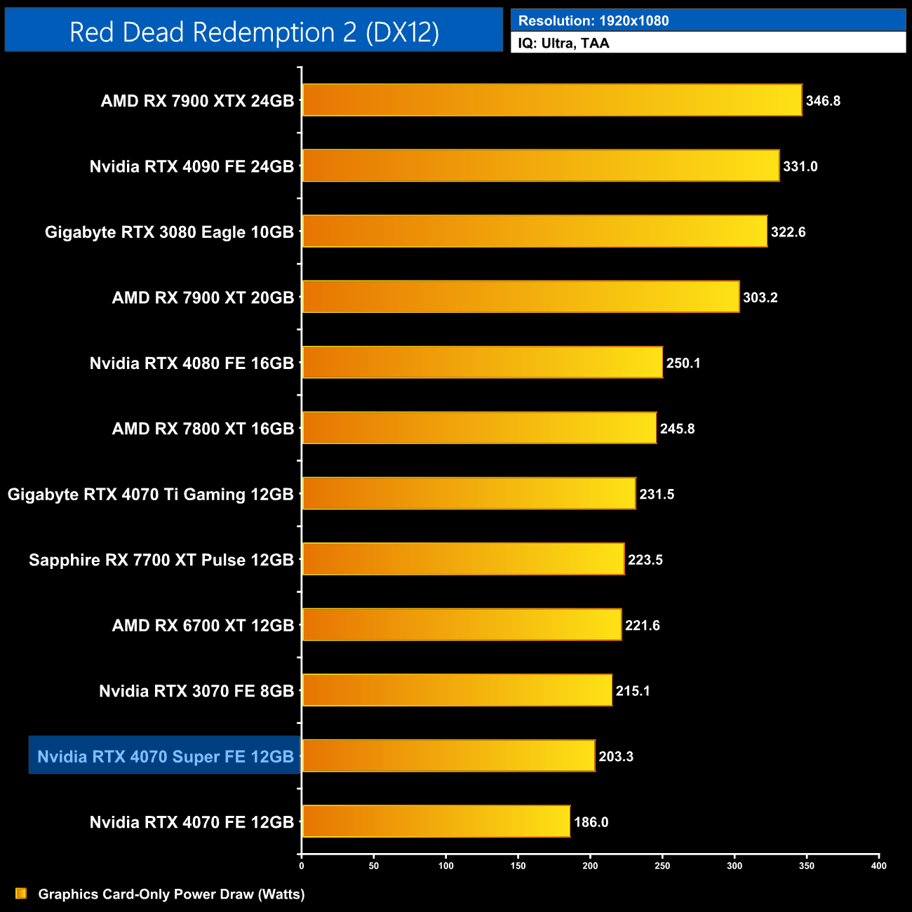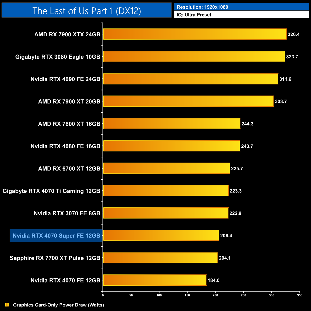 Here we present power draw figures for the graphics card-only, on a per-game basis for all twelve games we tested at 1080p. This is measured using Nvidia's Power Capture Analysis Tool, also known as PCAT. You can read more about our updated power draw testing methodology HERE.