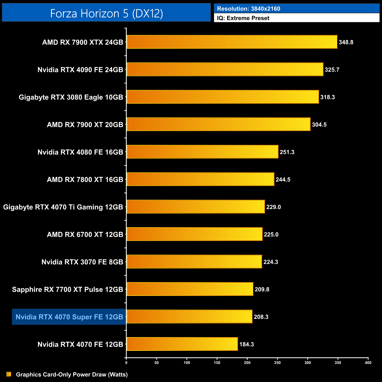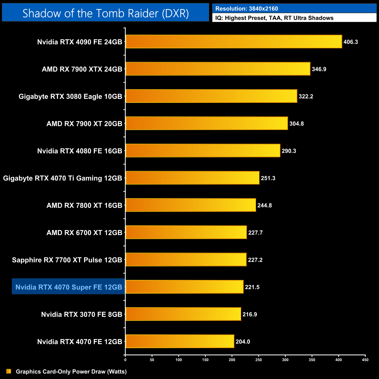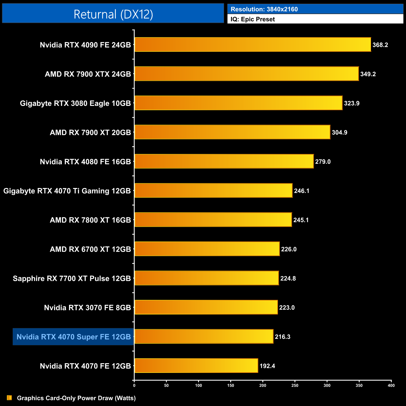 Here we present power draw figures for the graphics card-only, on a per-game basis for all twelve games we tested at 2160p (4K). This is measured using Nvidia's Power Capture Analysis Tool, also known as PCAT. You can read more about our updated power draw testing methodology HERE.