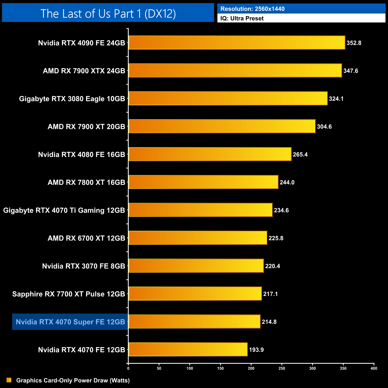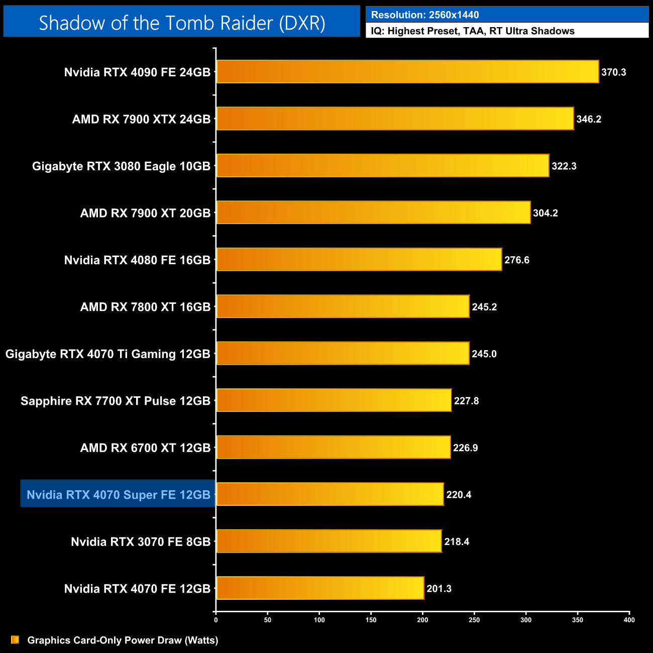 Here we present power draw figures for the graphics card-only, on a per-game basis for all twelve games we tested at 1440p. This is measured using Nvidia's Power Capture Analysis Tool, also known as PCAT. You can read more about our updated power draw testing methodology HERE.