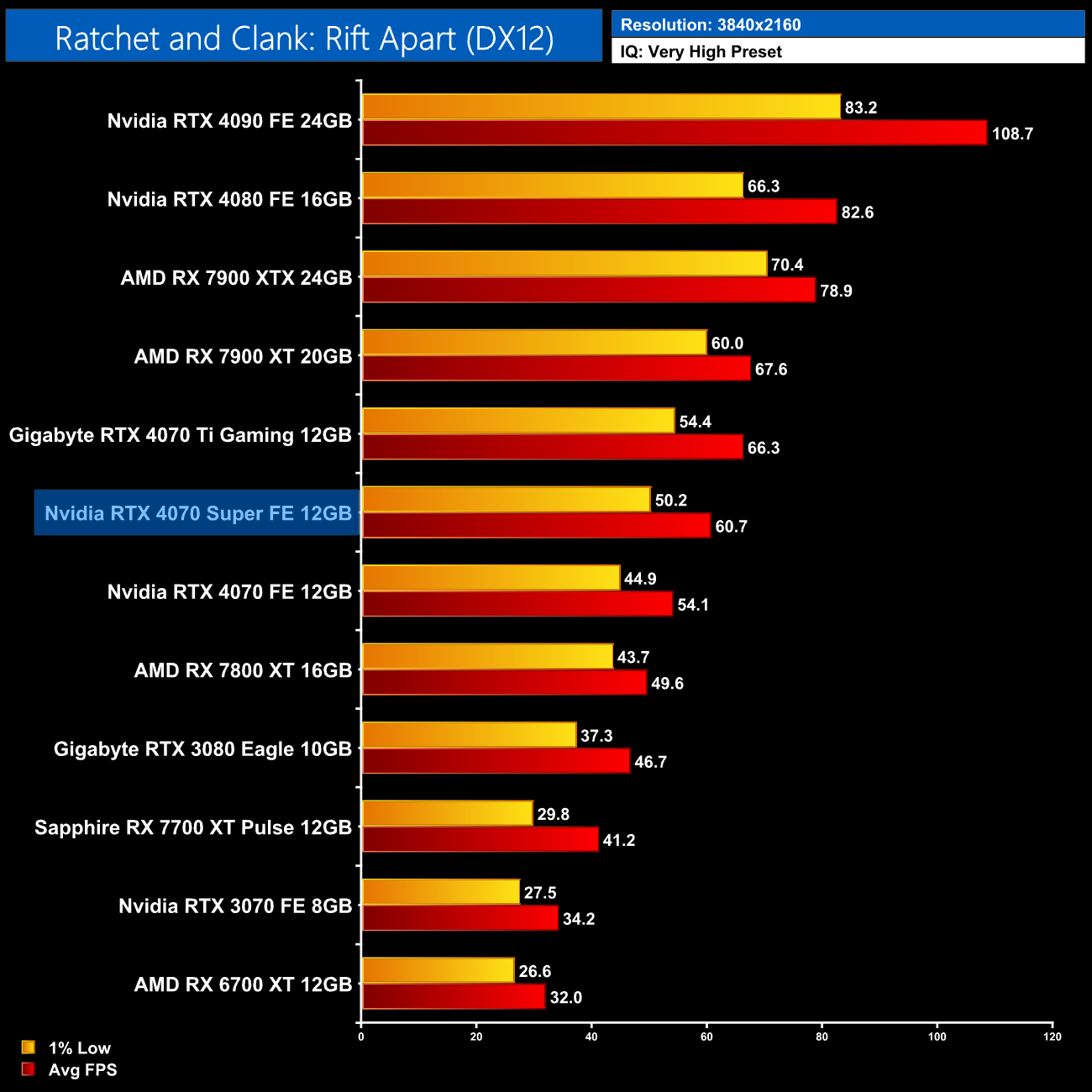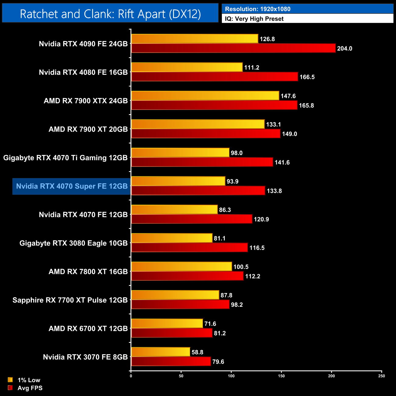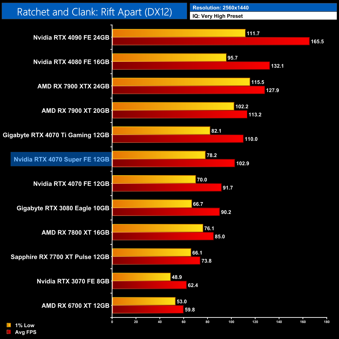 Ratchet and Clank is next, and with ray tracing maxed out, AMD GPUs absolutely crumble. At 1440p for instance, the RTX 4070 Super is faster than AMD's flagship 7900 XTX by a 29% margin. Compared to the RX 7800 XT, we're talking about almost a doubling of the frame rate.
