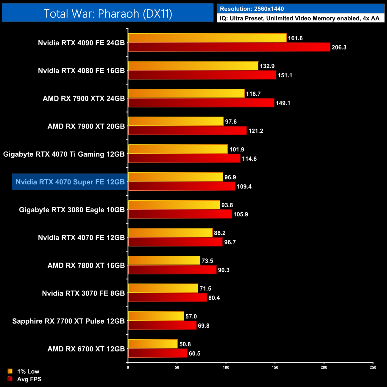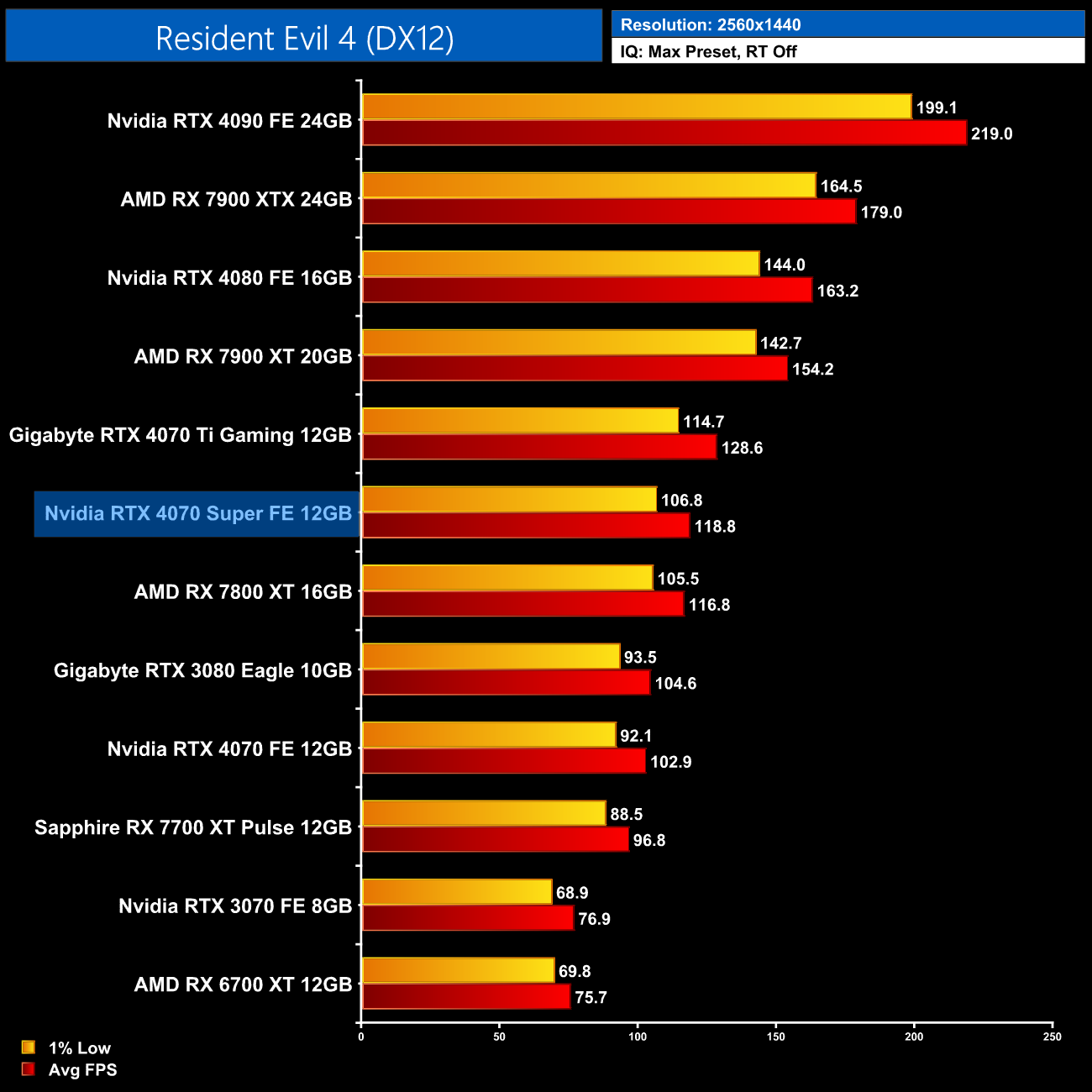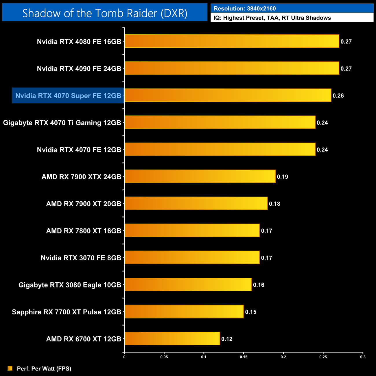 Lastly, we finish up with Shadow of the Tomb Raider. Despite being one of the first ray-traced games to hit the market back in 2019, while only featuring ray traced shadows, we still see a clear lead for Nvidia hardware in this title. The 4070 Super is 43% faster than the RX 7800 XT at 1440p for instance, while it's within touching distance of the RX 7900 XTX.