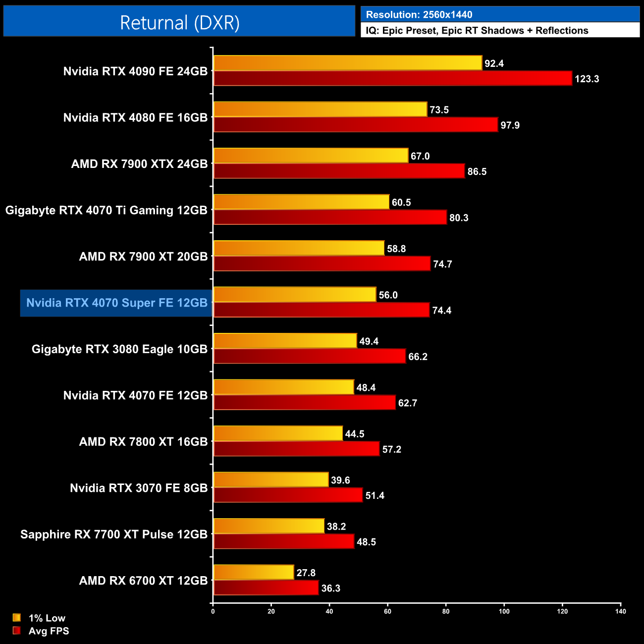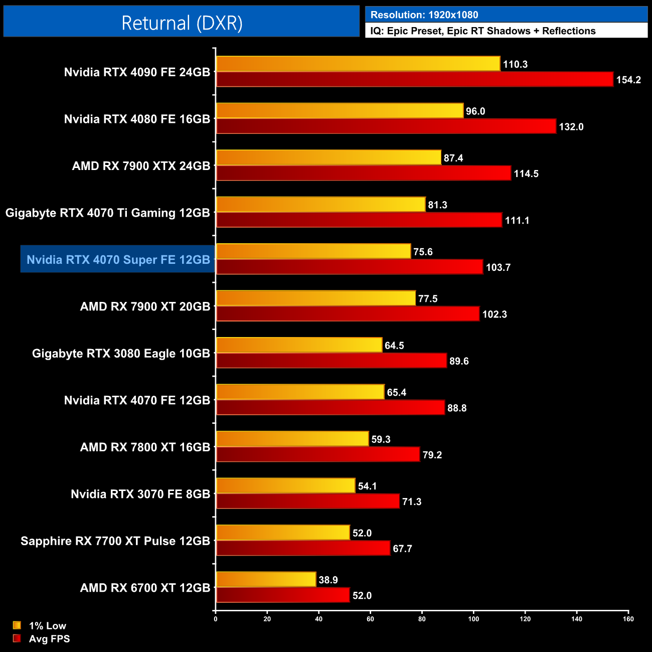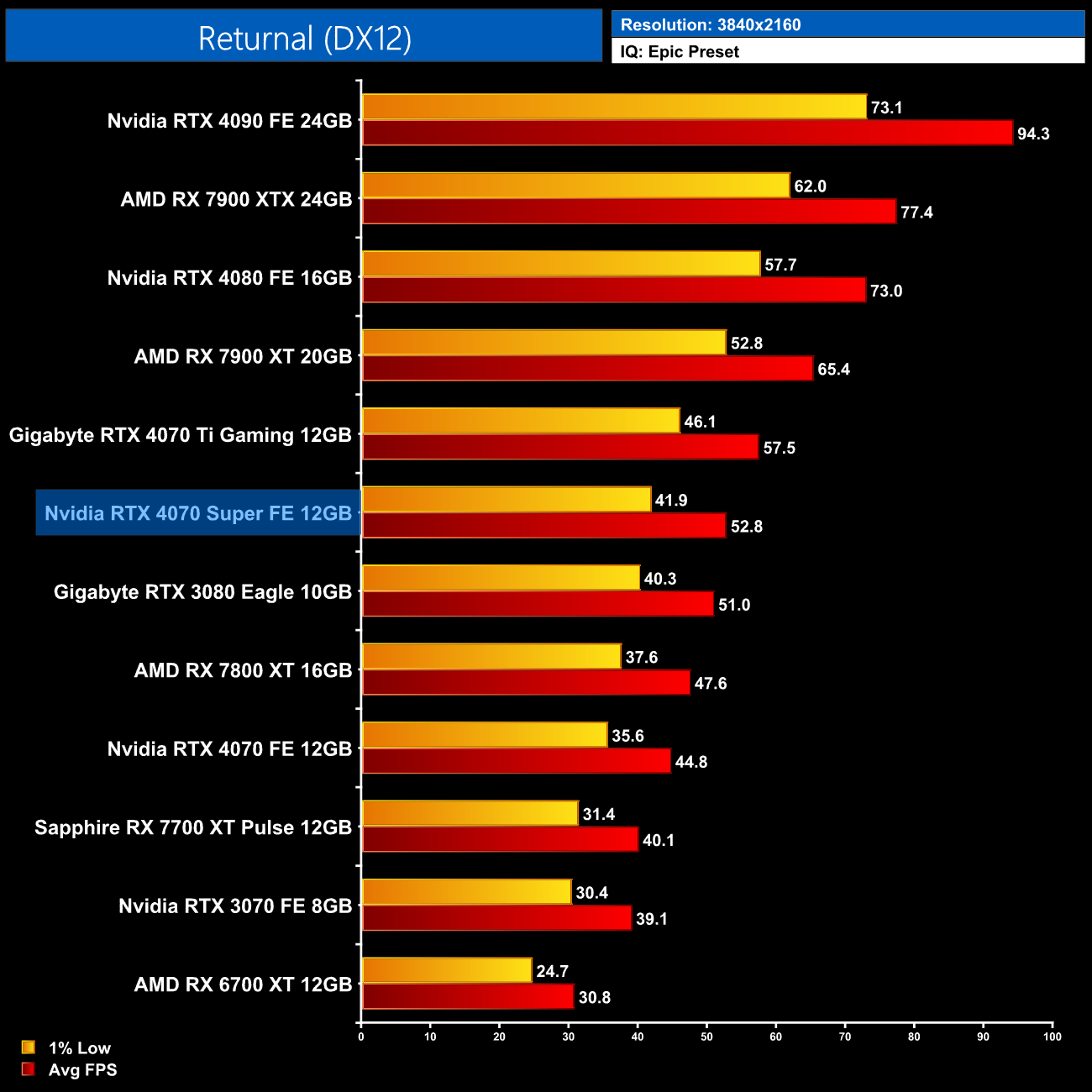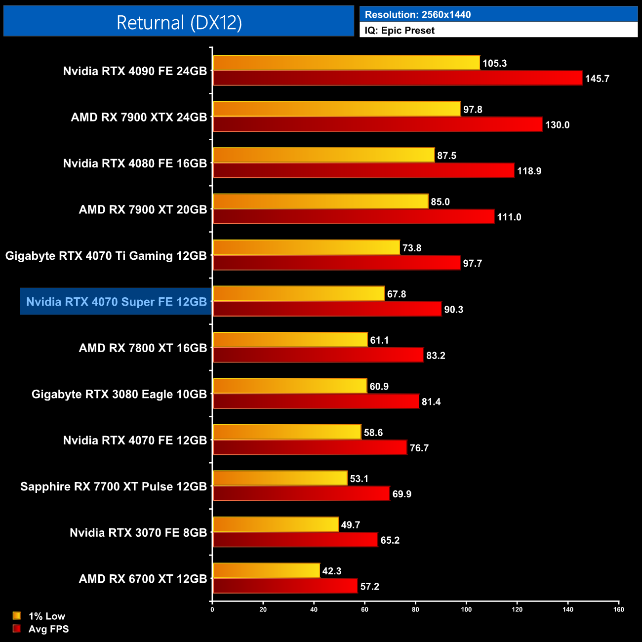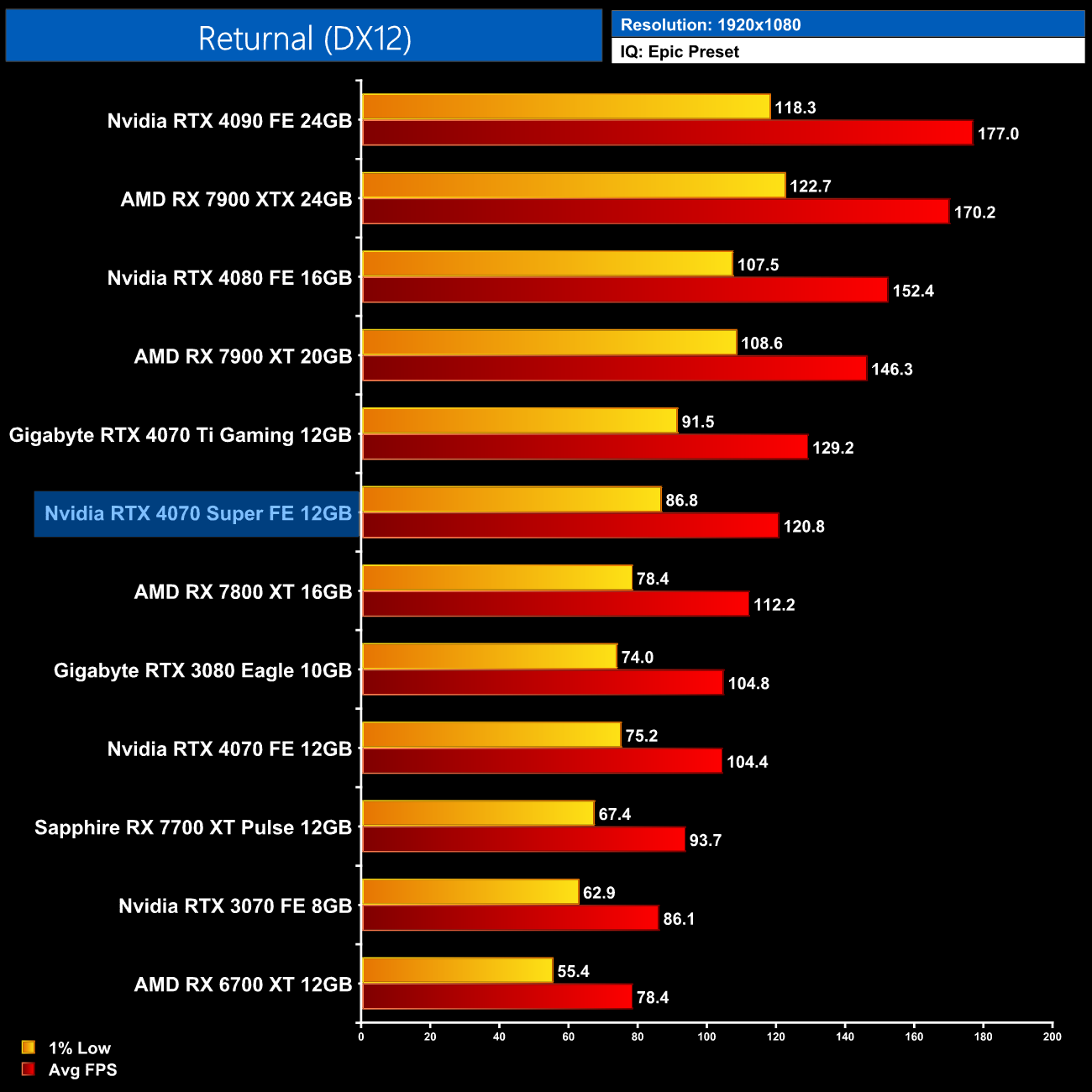 AMD GPUs do fare better in the Unreal Engine 4-based Returnal, though the 4070 Super is still 30% ahead of the RX 7800 XT. It's also 19% ahead of the 4070 but only 7% slower than the 4070 Ti.