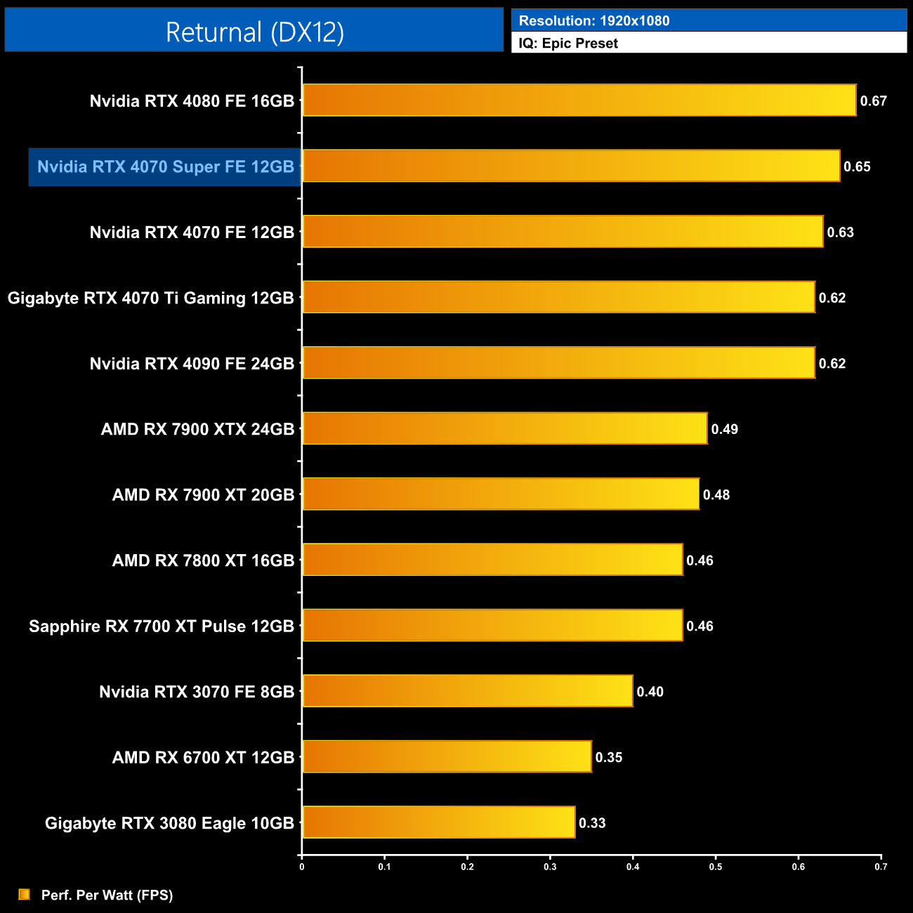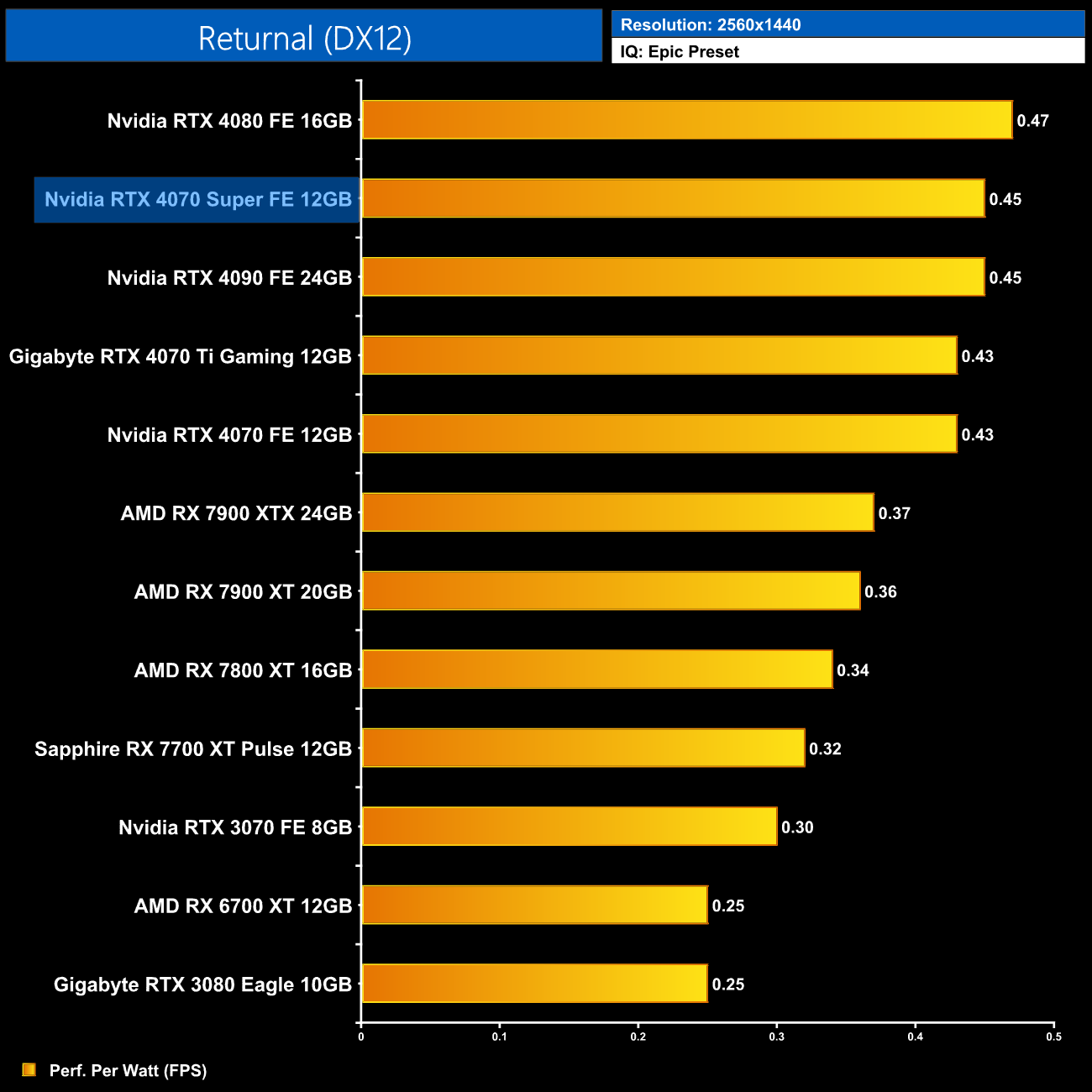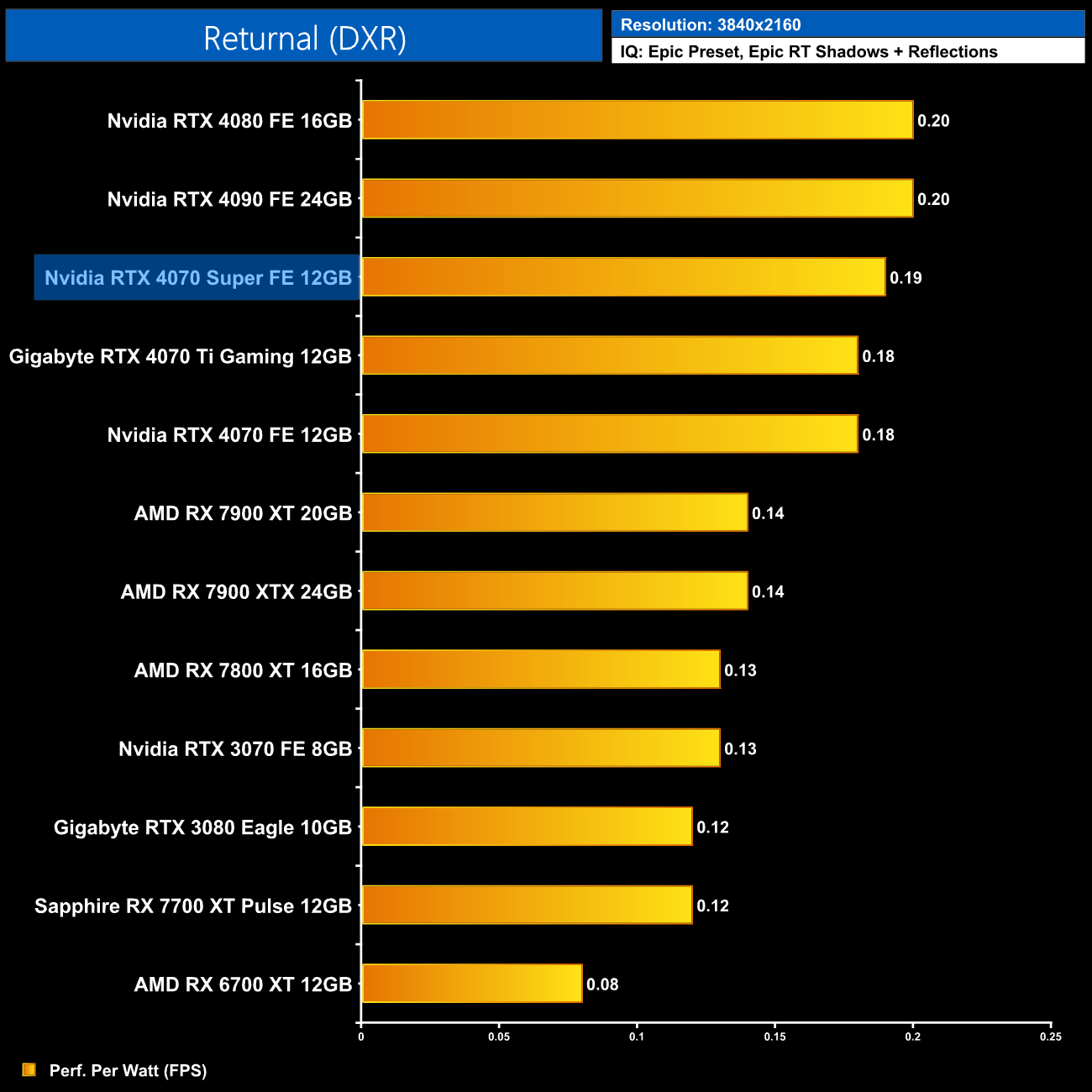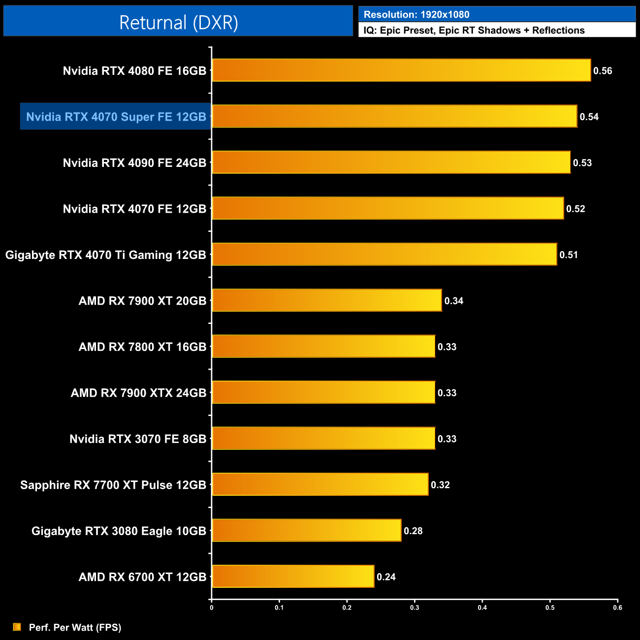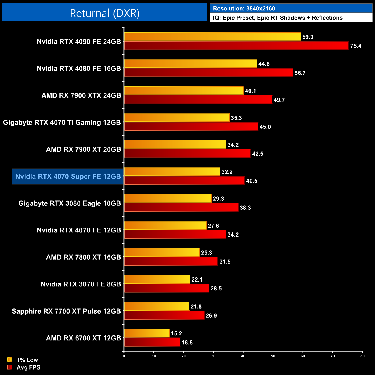 AMD GPUs do fare better in the Unreal Engine 4-based Returnal, though the 4070 Super is still 30% ahead of the RX 7800 XT. It's also 19% ahead of the 4070 but only 7% slower than the 4070 Ti.