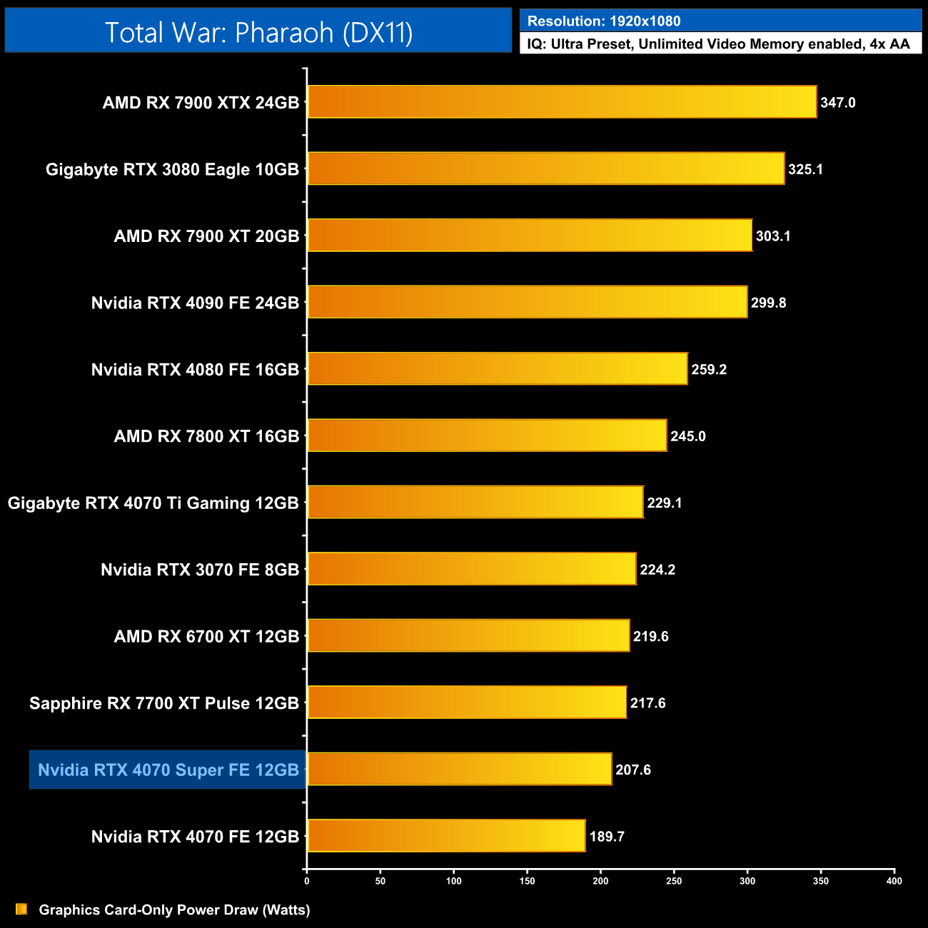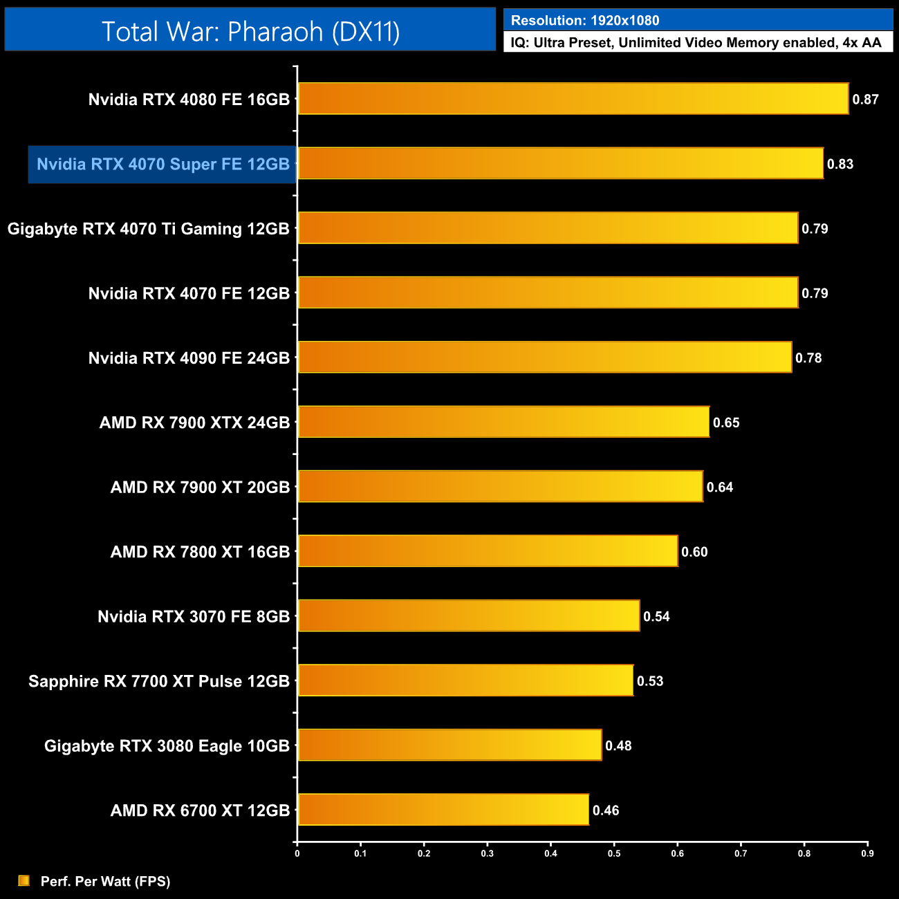 Using the graphics card-only power draw figures presented earlier in the review, here we present performance per Watt on a per-game basis for all twelve games we tested at 1080p.