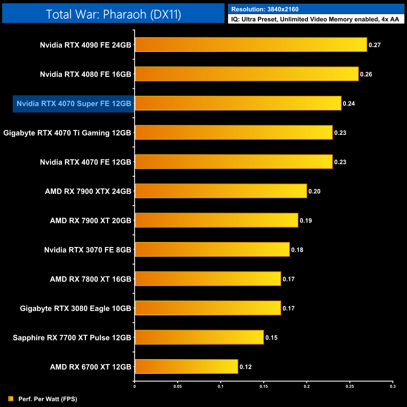 Using the graphics card-only power draw figures presented earlier in the review, here we present performance per Watt on a per-game basis for all twelve games we tested at 2160p (4K).
