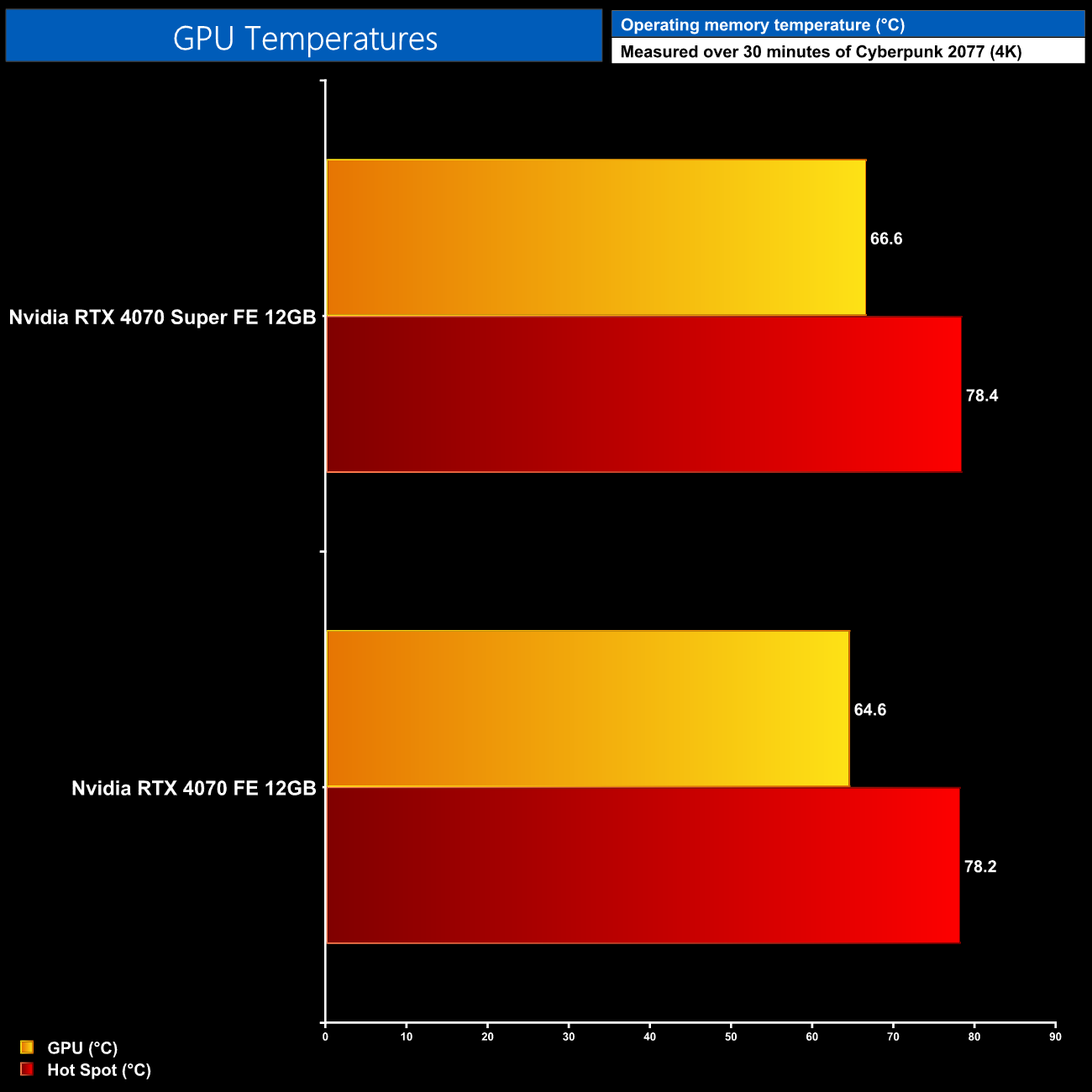 Likewise, GDDR6X memory temperatures peaked just 2C hotter on the 4070 Super, but it's still well within safe limits.
