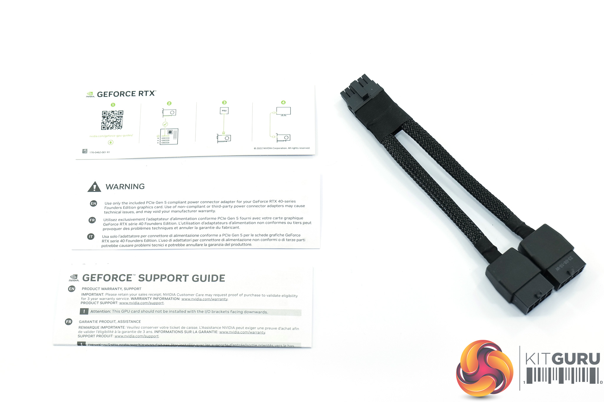 Inside, we find a few support guides and pieces of documentation, along with a dual 8-pin to 16-pin 12VHPWR adapter.