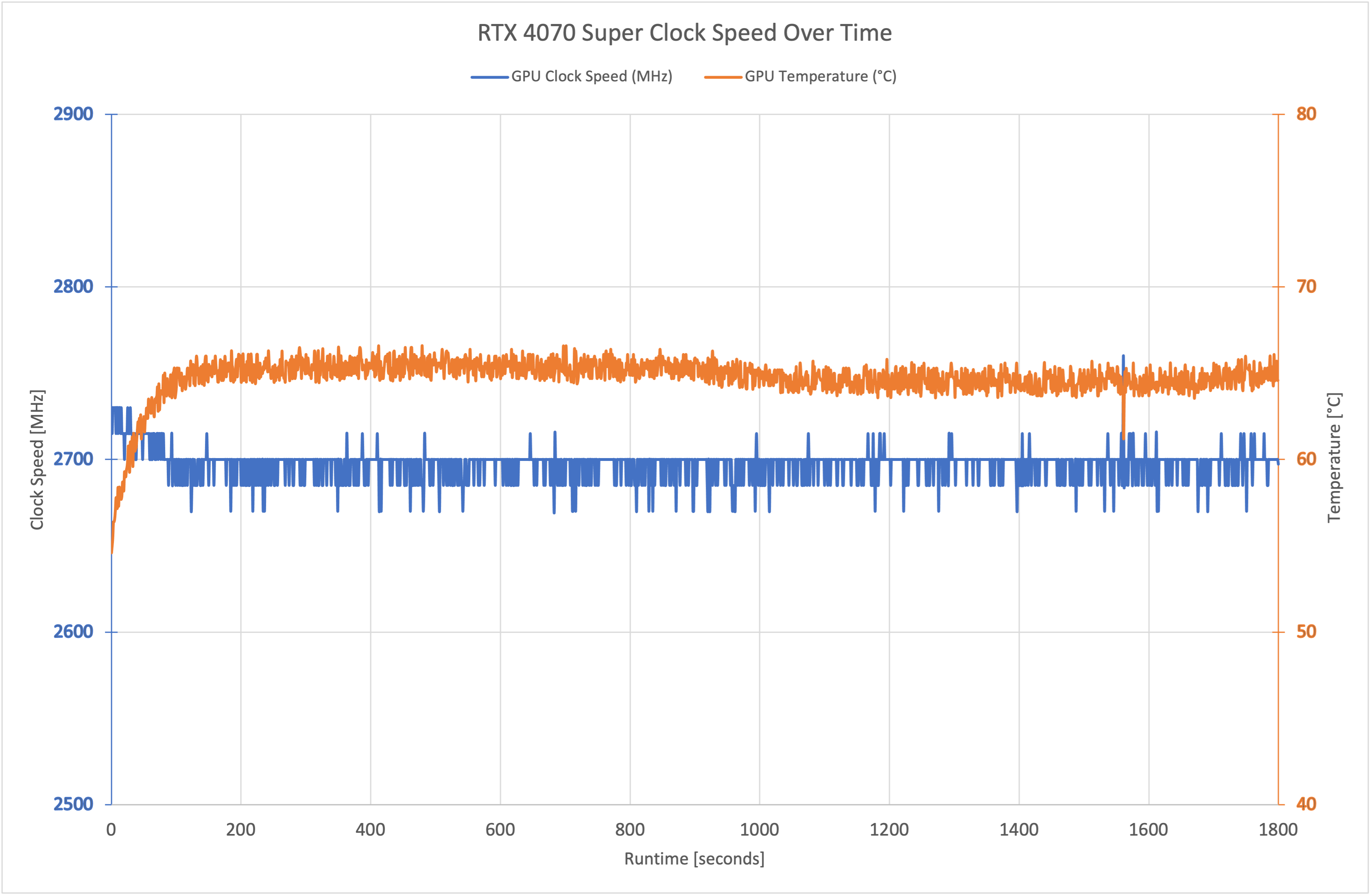 We're not yet allowed to share comparison data of the two RTX 4070 Super AIB cards we have tested as they are OC models, so those reviews will drop tomorrow, January 17th. For now, we've just used the vanilla RTX 4070 as a point of reference, and we can see that the 4070 Super does clock a touch lower, despite having the same rated boost clock, with a real-world average of 2697MHz over our 30-minute stress test in Cyberpunk 2077.