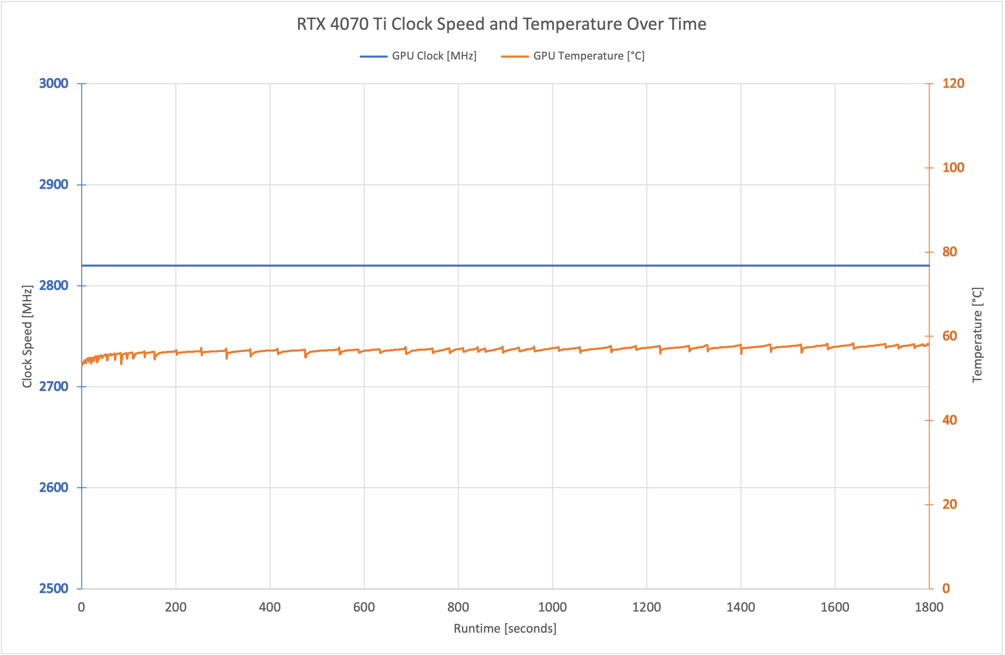 Interestingly, the GPU clock speed proved to be absolutely locked in at 2820MHz during our stress test. Usually the GPU frequency bounces around somewhat as the chip hits its power limit and drops back, but the 4070 Ti does not appear to be power limited at all, so we get a completely flat line when looking at the frequency chart.