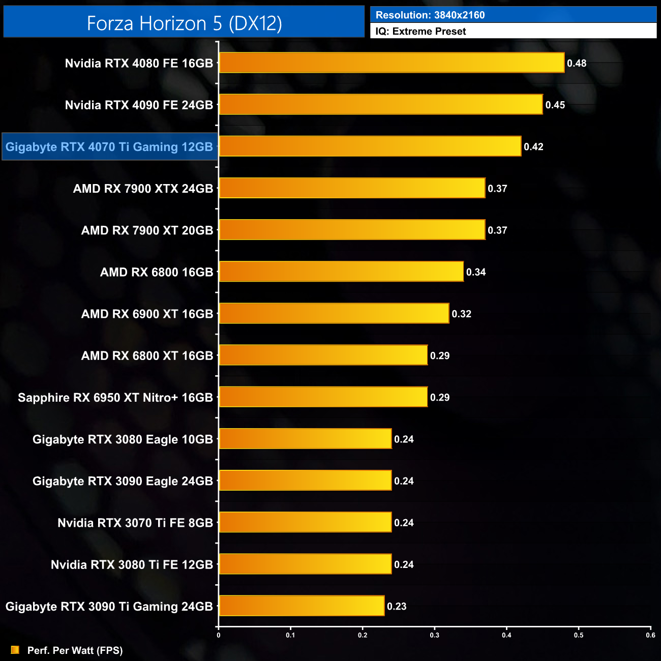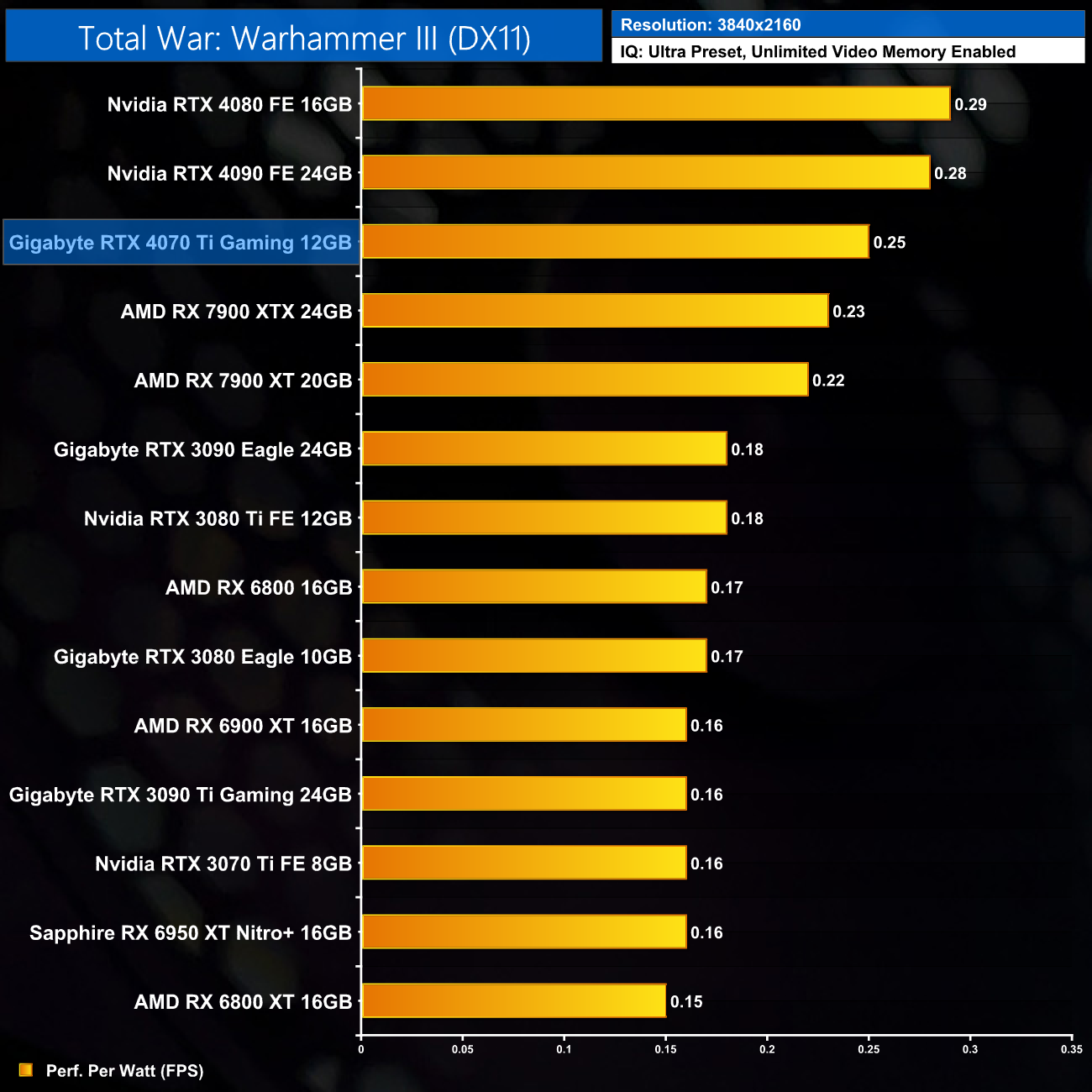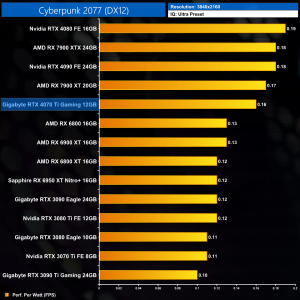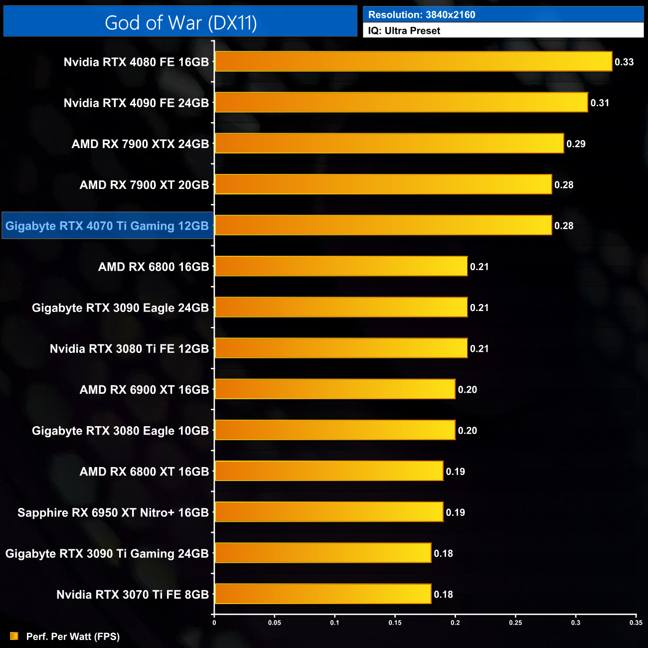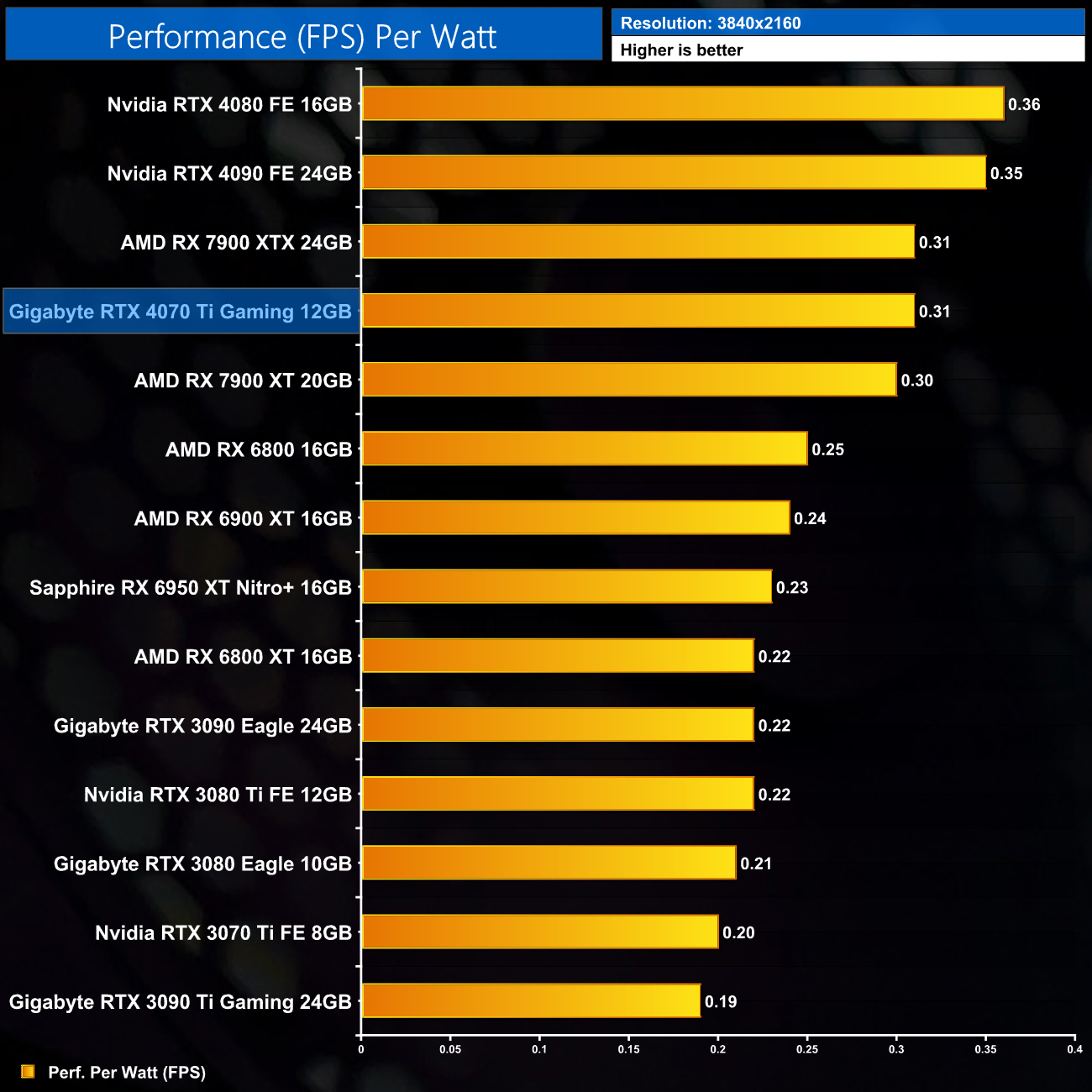 Lastly, at 4K, overall efficiency of the RTX 4070 Ti is now a match for the RX 7900 XTX, with performance per Watt coming in 12% lower than the RTX 4090, and 14% below the RTX 4080. It's perhaps surprising but this is the least efficient RTX 40-series GPU released so far.