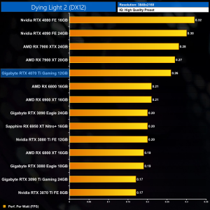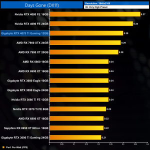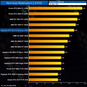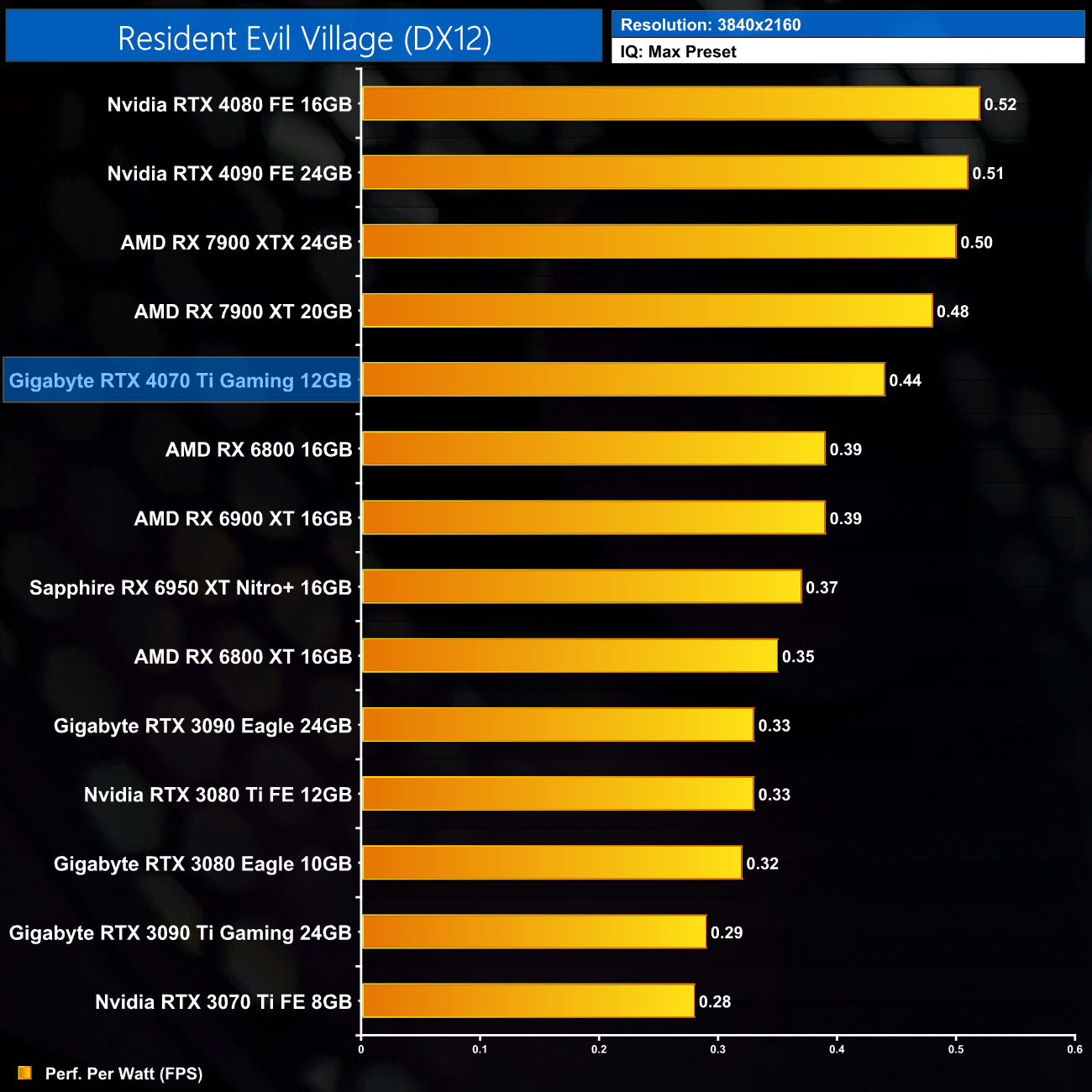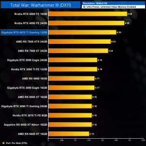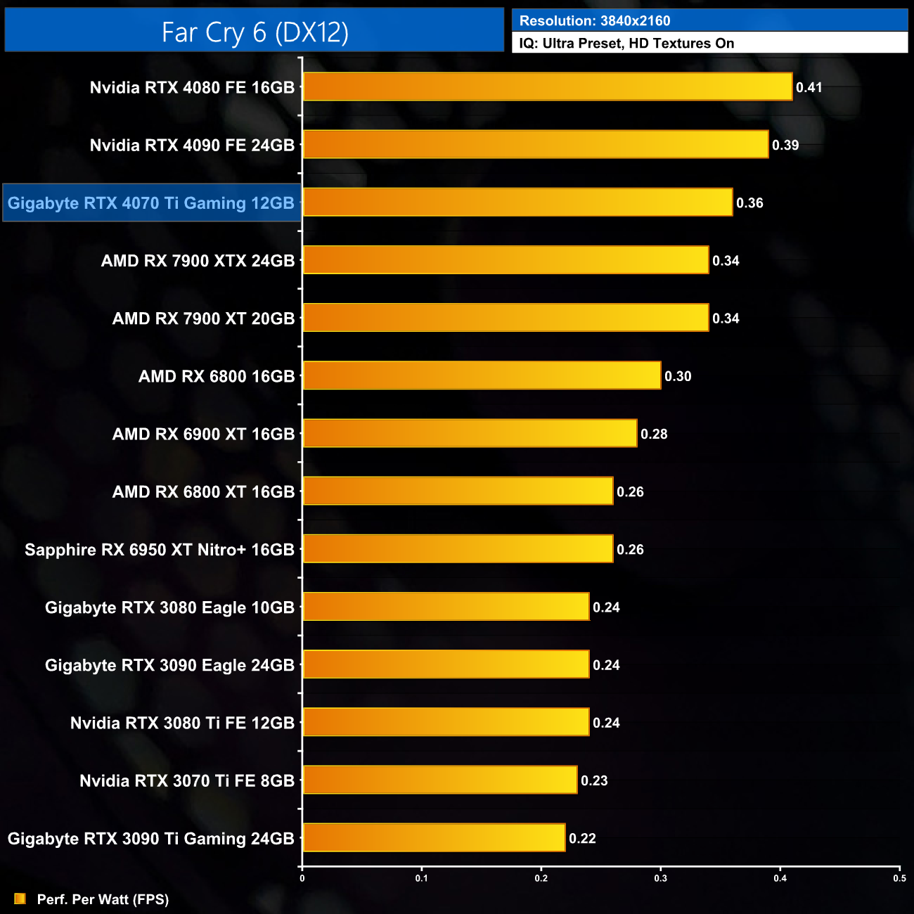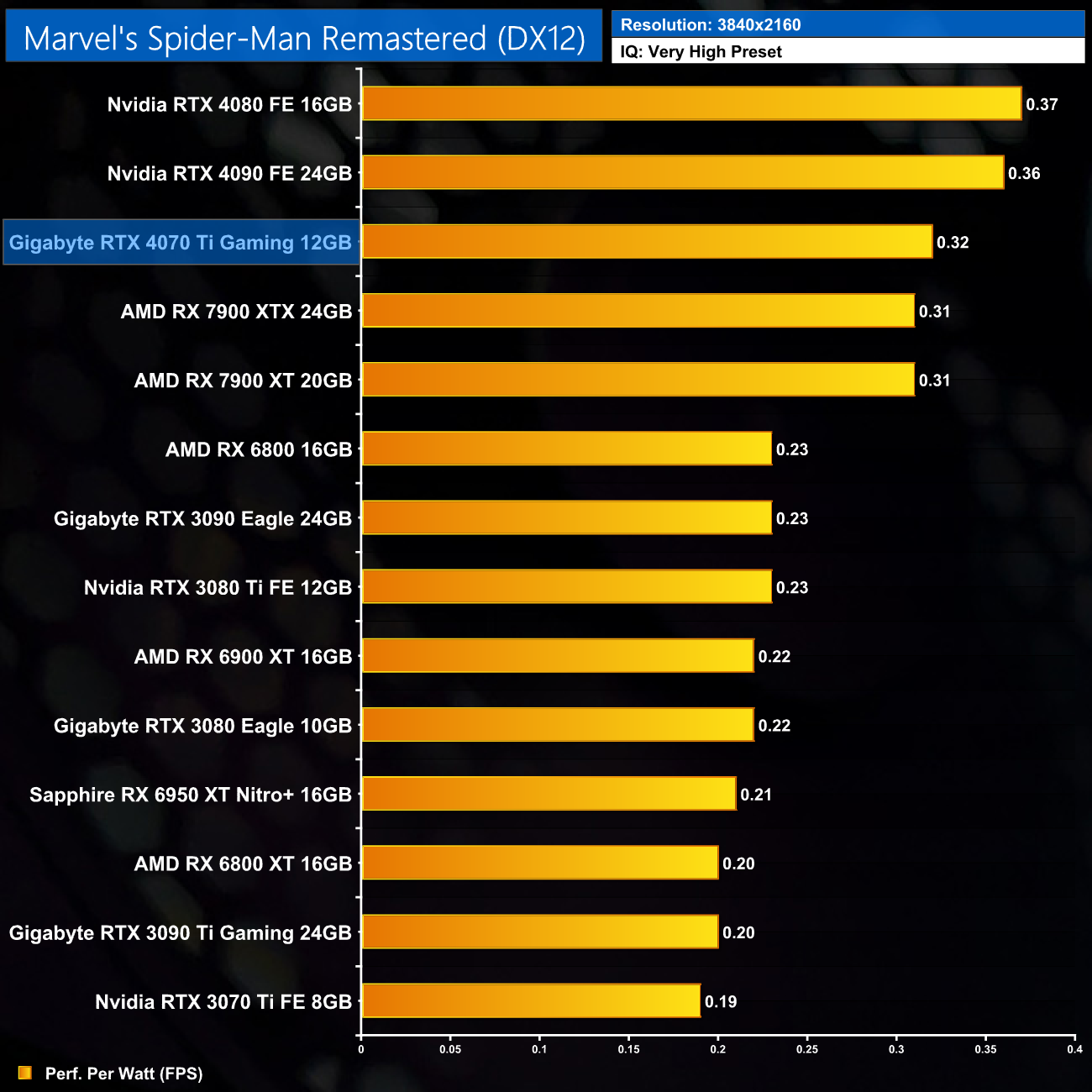 Lastly, at 4K, overall efficiency of the RTX 4070 Ti is now a match for the RX 7900 XTX, with performance per Watt coming in 12% lower than the RTX 4090, and 14% below the RTX 4080. It's perhaps surprising but this is the least efficient RTX 40-series GPU released so far.