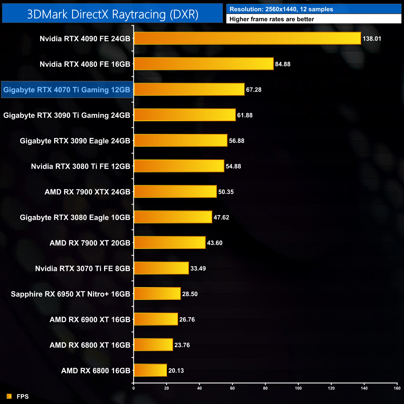 As a test of pure ray tracing performance, the 3DMark DXR feature test is always an interesting benchmark. The RTX 4070 Ti outpaces the RTX 3090 Ti handily here, with a 9% performance boost, though it trails the RTX 4080 significantly, coming in 21% slower.