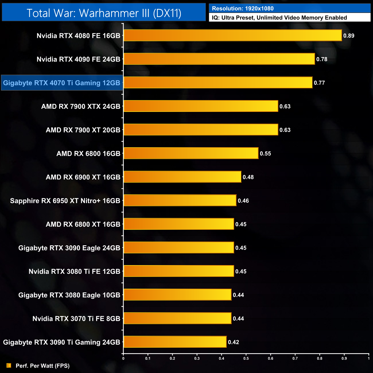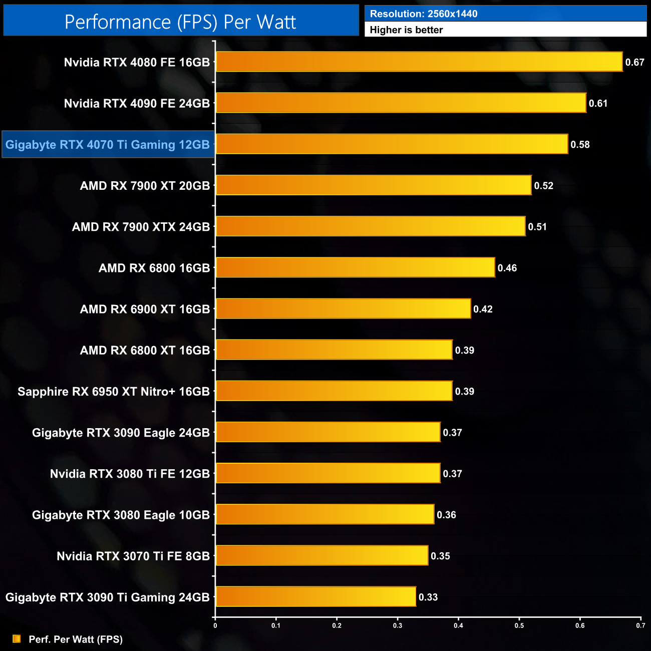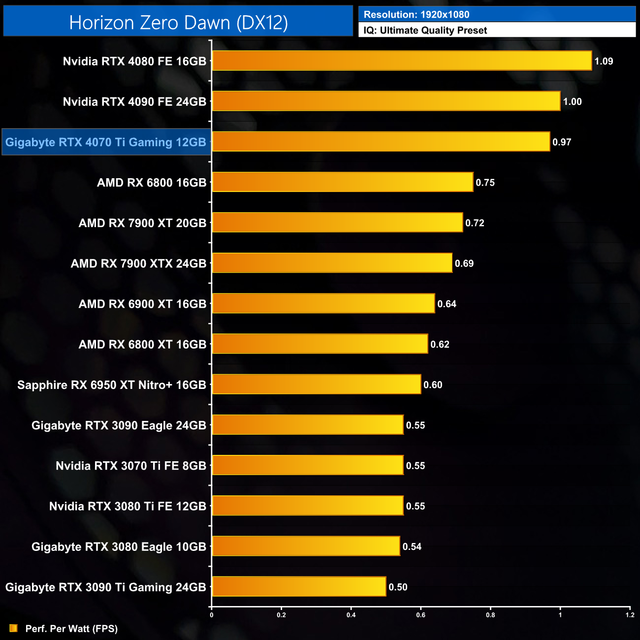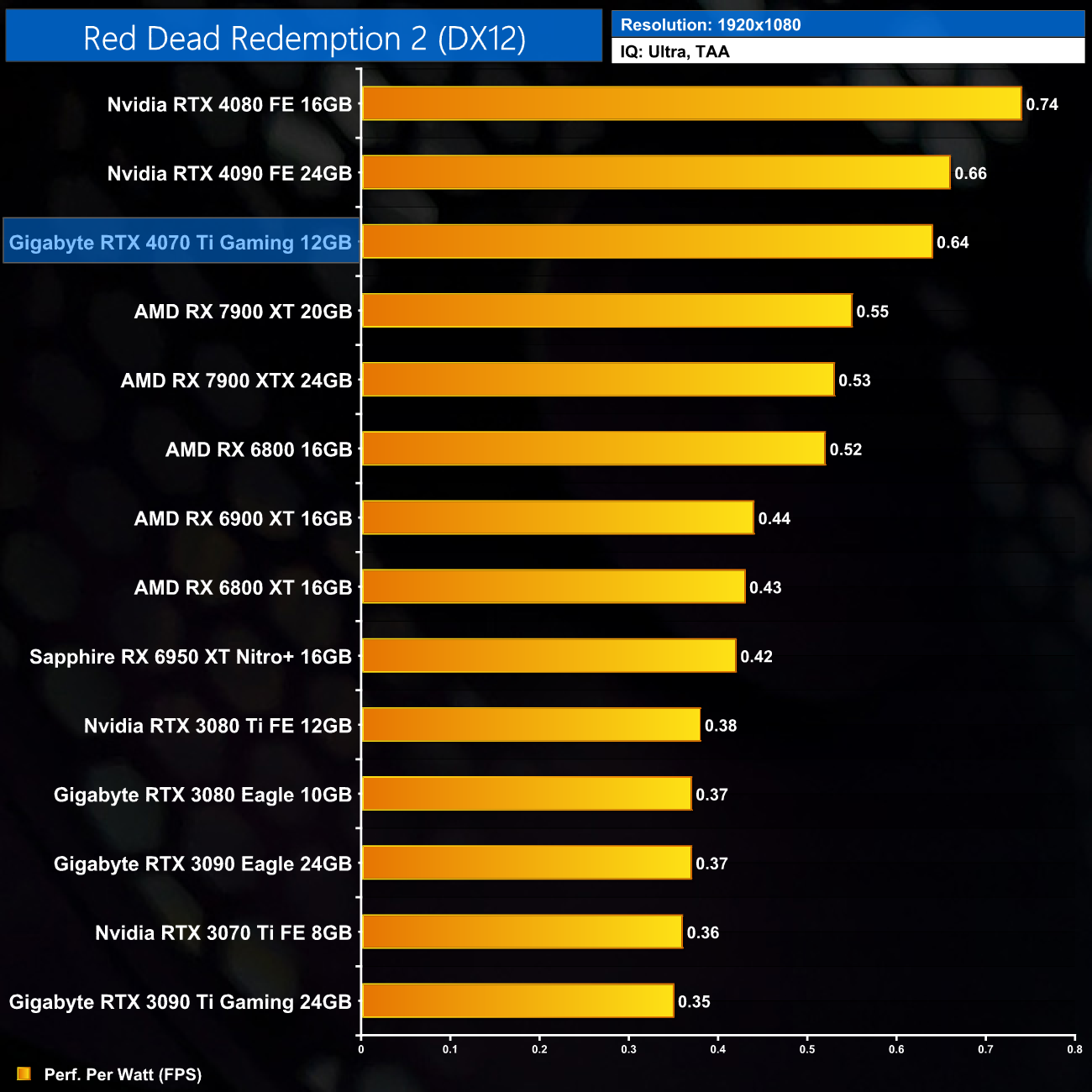 Lastly, at 4K, overall efficiency of the RTX 4070 Ti is now a match for the RX 7900 XTX, with performance per Watt coming in 12% lower than the RTX 4090, and 14% below the RTX 4080. It's perhaps surprising but this is the least efficient RTX 40-series GPU released so far.