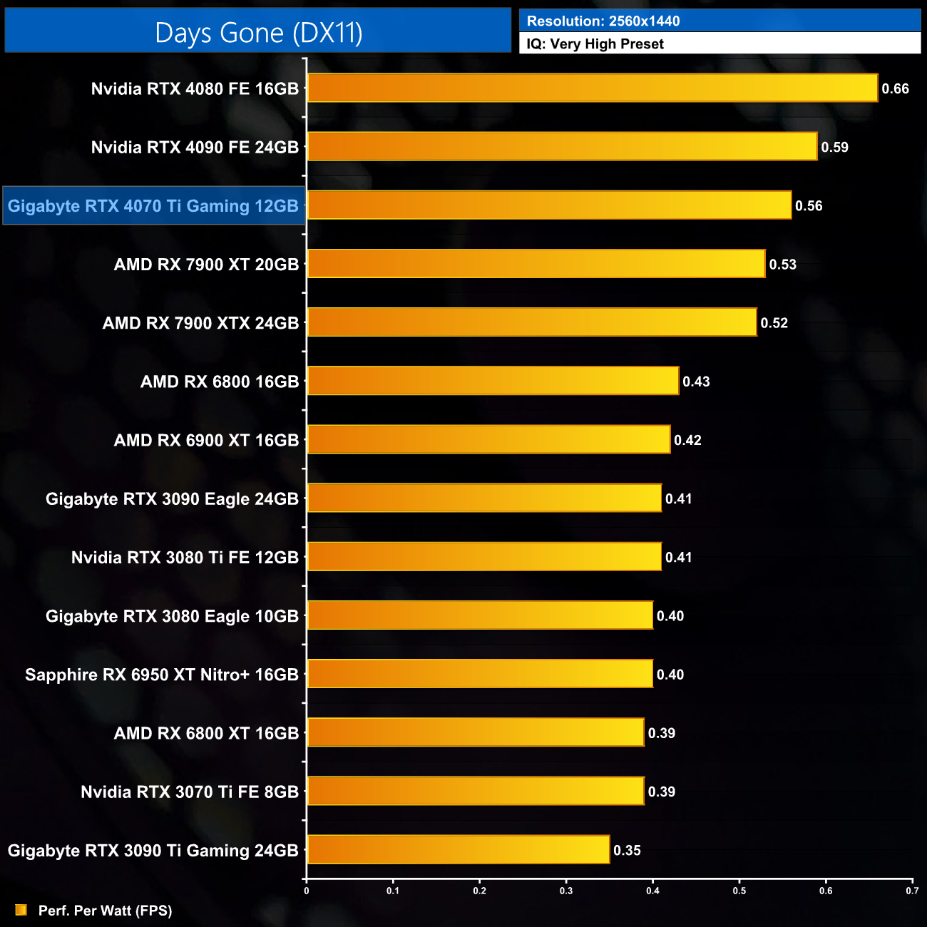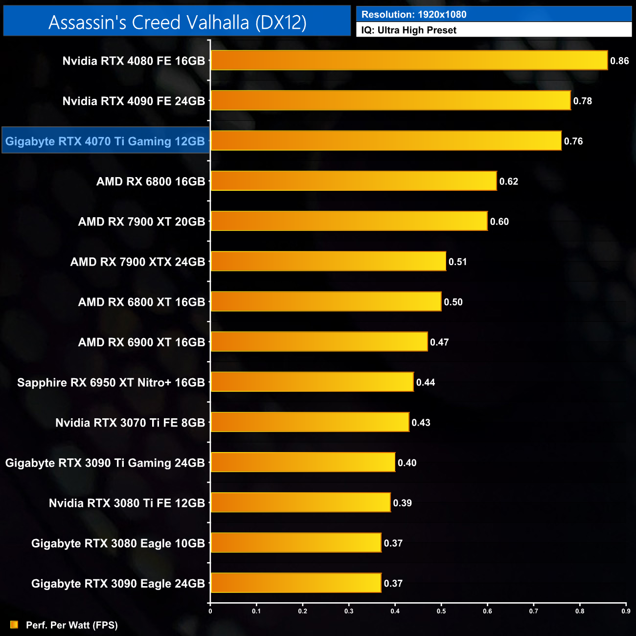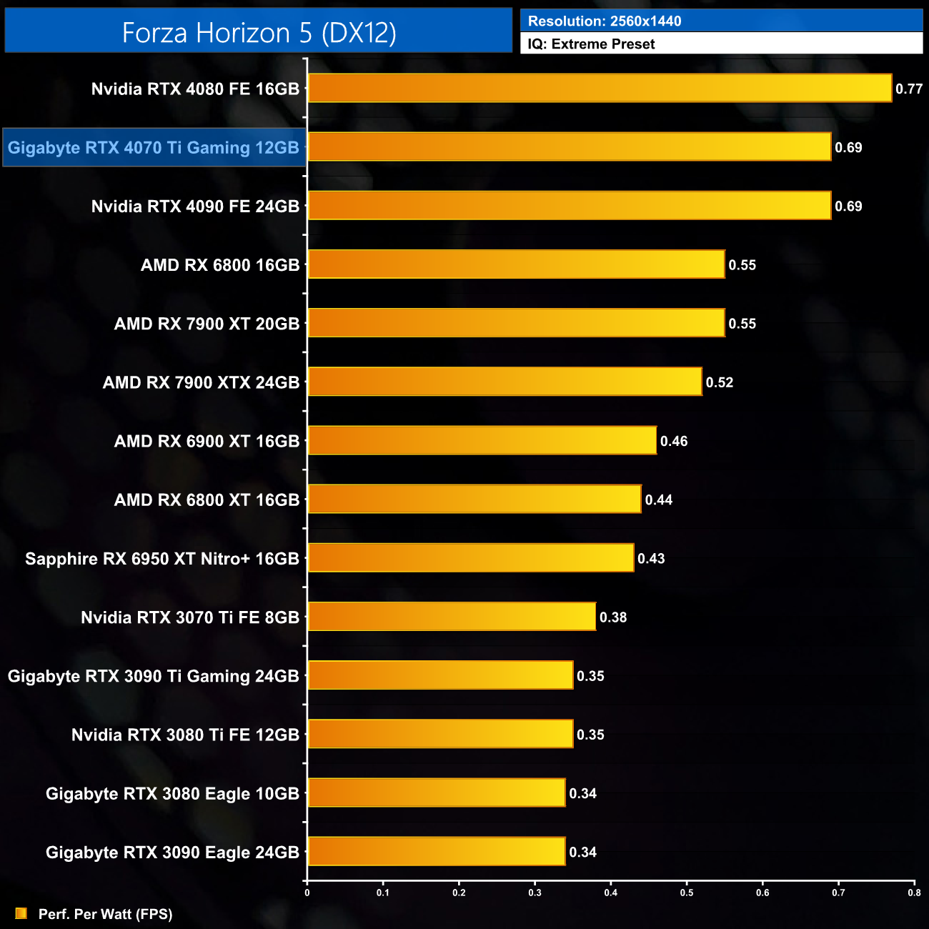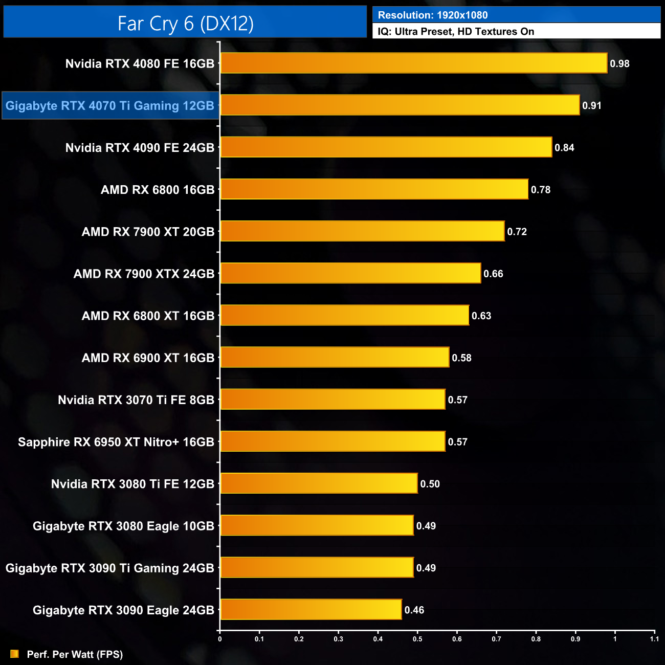 Lastly, at 4K, overall efficiency of the RTX 4070 Ti is now a match for the RX 7900 XTX, with performance per Watt coming in 12% lower than the RTX 4090, and 14% below the RTX 4080. It's perhaps surprising but this is the least efficient RTX 40-series GPU released so far.