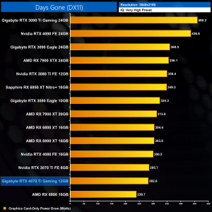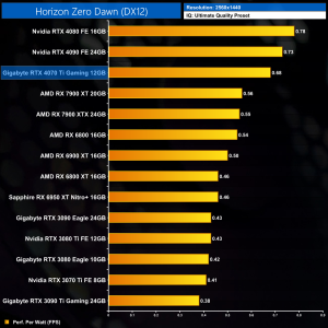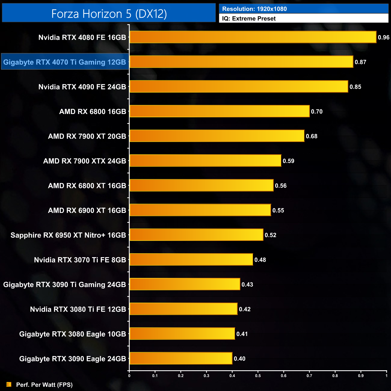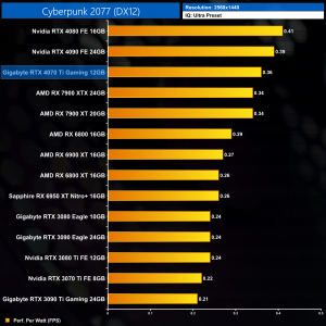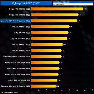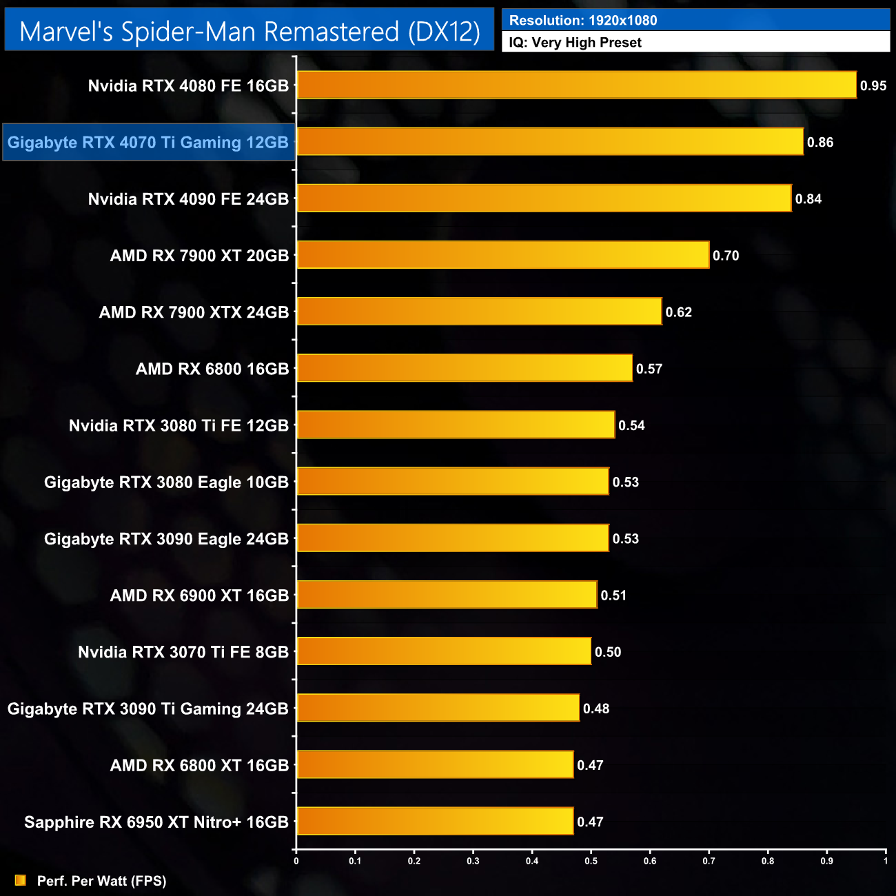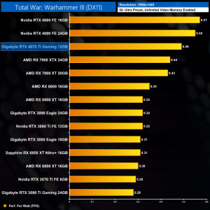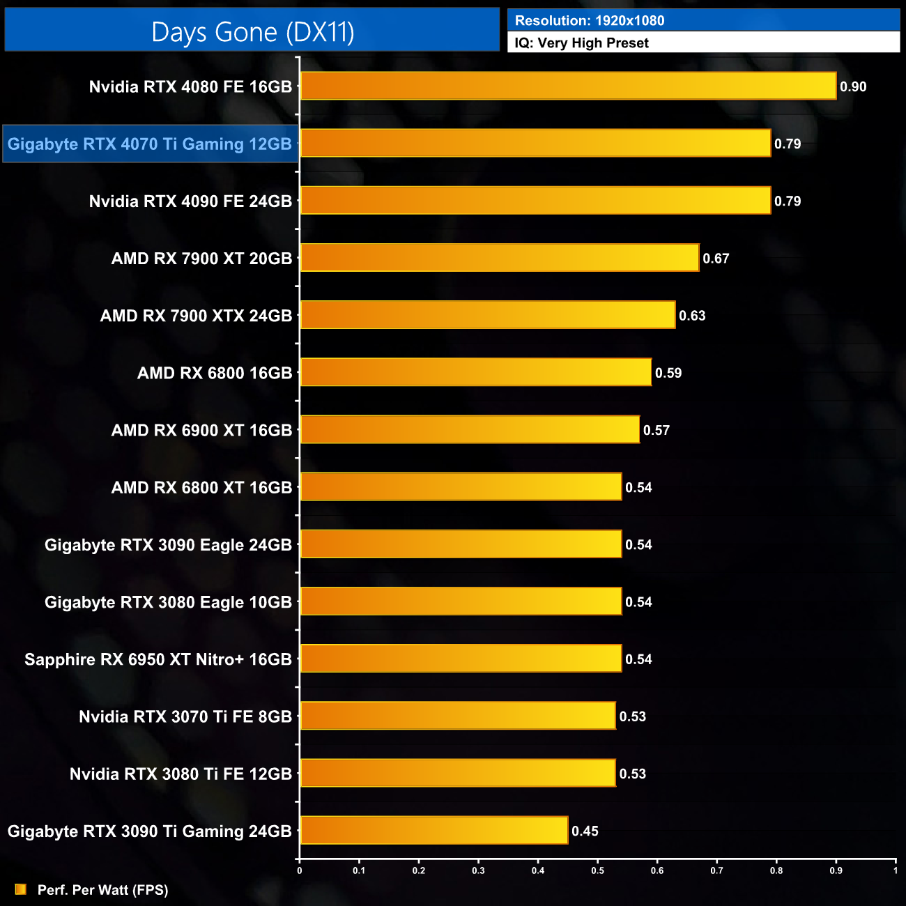 Lastly, at 4K, overall efficiency of the RTX 4070 Ti is now a match for the RX 7900 XTX, with performance per Watt coming in 12% lower than the RTX 4090, and 14% below the RTX 4080. It's perhaps surprising but this is the least efficient RTX 40-series GPU released so far.