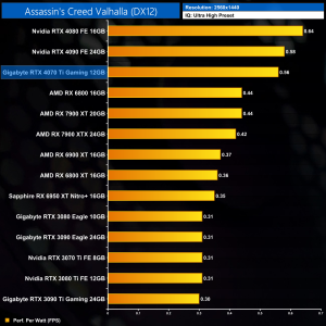 Using the graphics card-only power draw figures presented earlier in the review, here we present performance per Watt on a per-game basis for all twelve games we tested at 1440p.