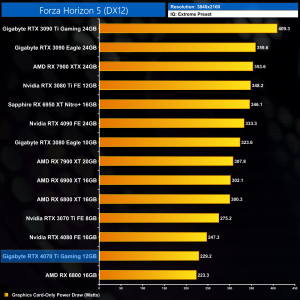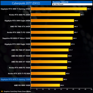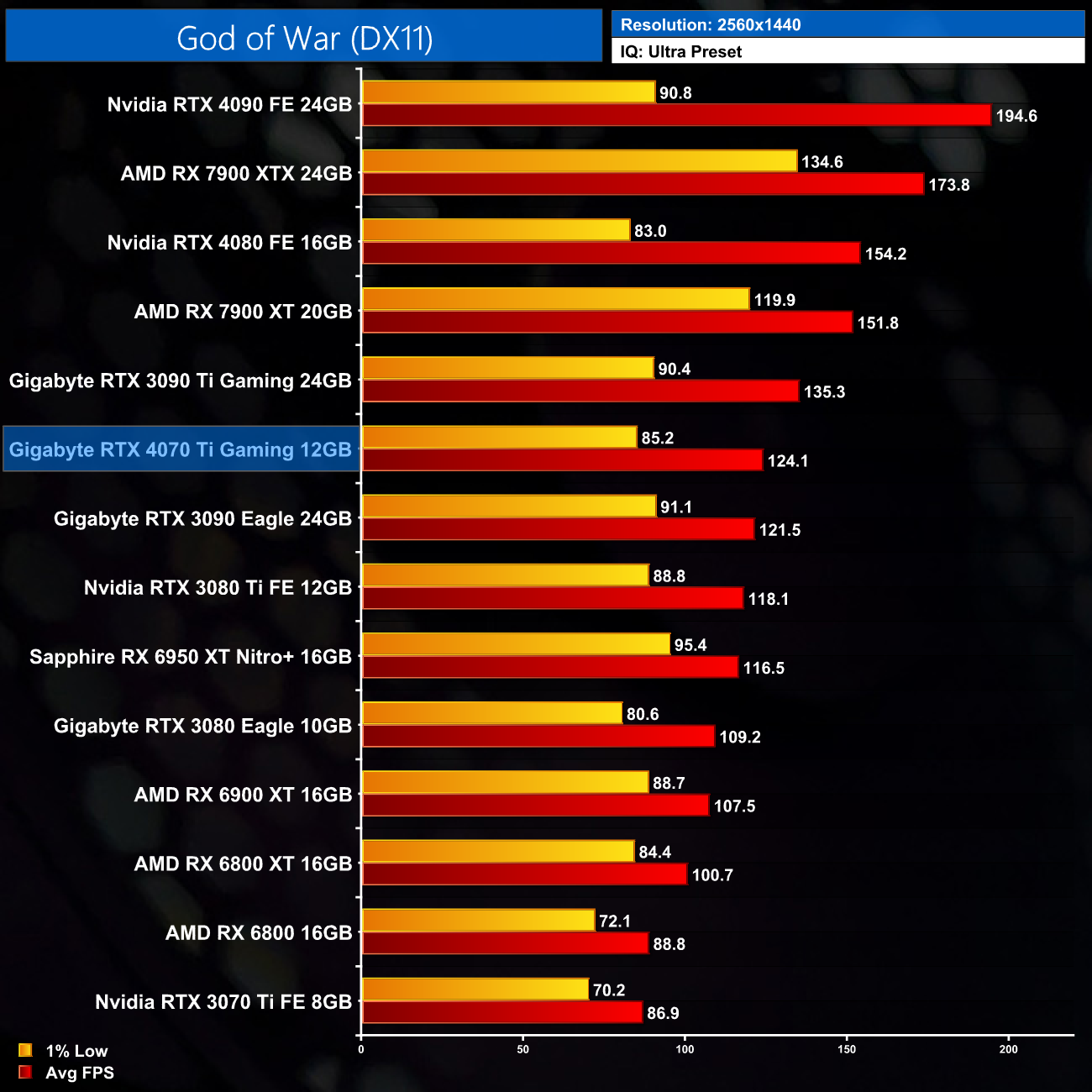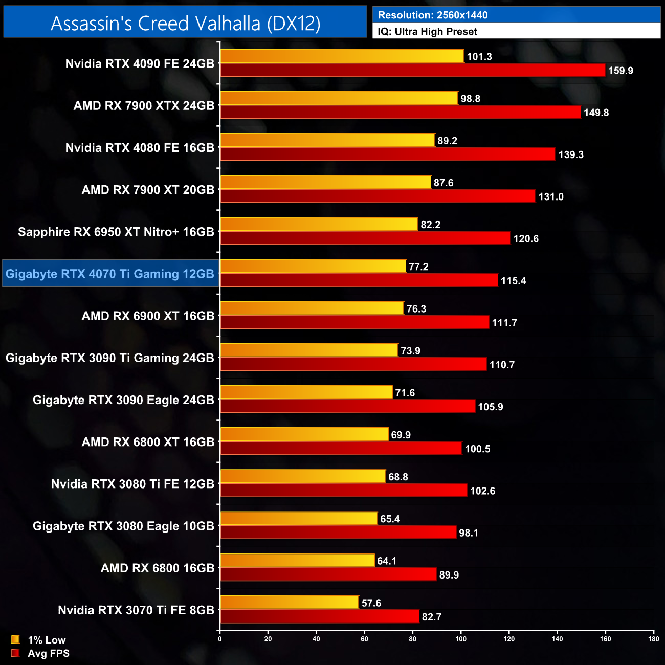 That's certainly the case when looking at overall performance, as this is a capable gaming GPU. I’d say it is best suited for high refresh-rate 1440p gaming, where it’s basically a match for the RTX 3090 Ti and is about 13% slower on average than the RX 7900 XT. It could also be a solid entry level 4K card, though it performs worse, relatively speaking, at the UHD resolution due to its pretty narrow memory interface; while it roughly matches the 3090 Ti at 1440p, it’s 9% slower at 4K. It can do a job and will still hit 60FPS in most titles, but the memory bandwidth limitation is much less of a factor at 1440p where the 4070 Ti is delivering 120FPS at ultra settings more often than not.