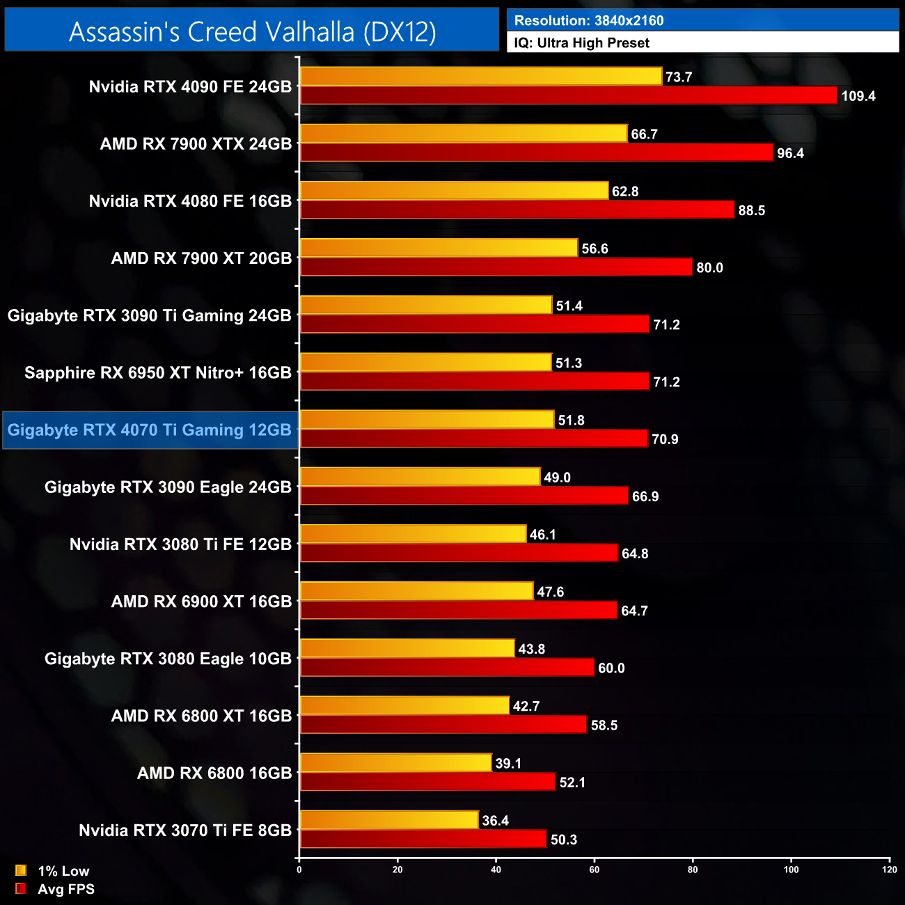 It does fall off a bit at 4K, coming in 8% slower than the 3090 Ti, but it's still averaging over 70FPS. Relative to the RTX 4080, we're looking at 22% less performance.