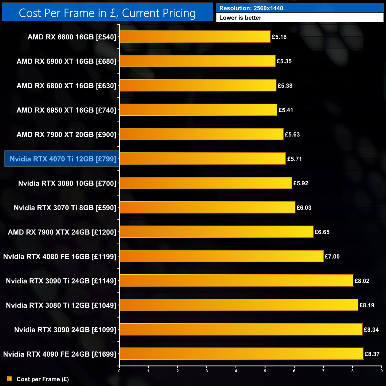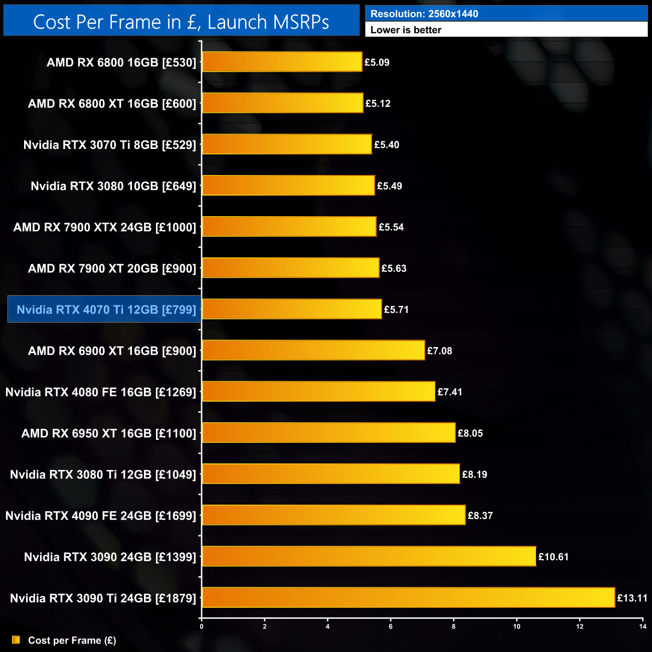 Clearly, it wasn't hard for the RTX 4070 Ti to look good against the RTX 4080 as it was never a very good value to begin with, but those hoping for a real generational improvement in cost per frame will be left disappointed. That said, there are other features to consider including DLSS 3 Frame Generation, which is definitely a value add, while ray tracing is generally more viable at 1440p with the 4070 Ti than previous 30-series cards.
