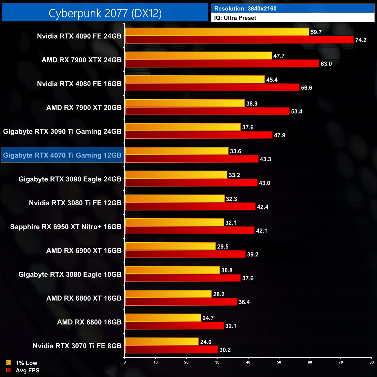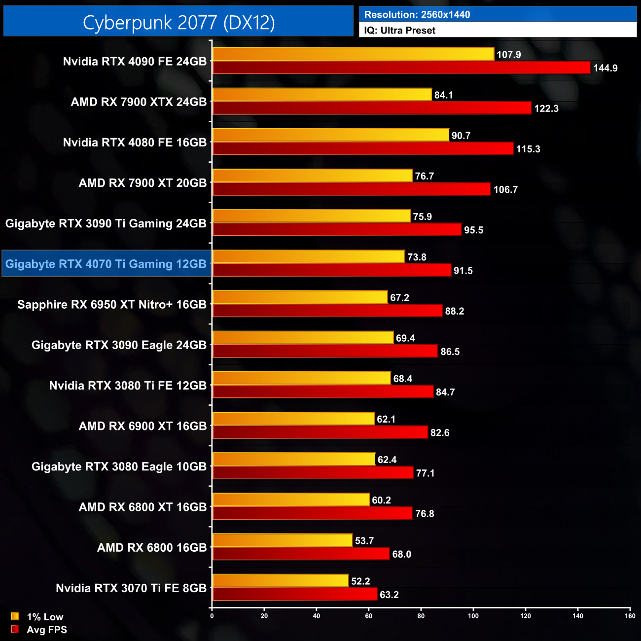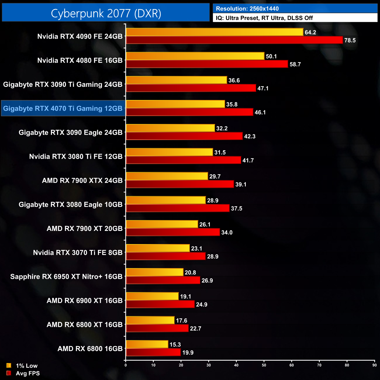Ray tracing performance in Cyberpunk 2077 scales very similarly to the rasterised numbers we saw earlier. At 1440p we're looking at almost identical results to the RTX 3090 Ti, so you would want to enable DLSS for a smoother experience, but the 4070 Ti is still 18% ahead of AMD's fastest, the RX 7900 XTX.