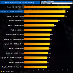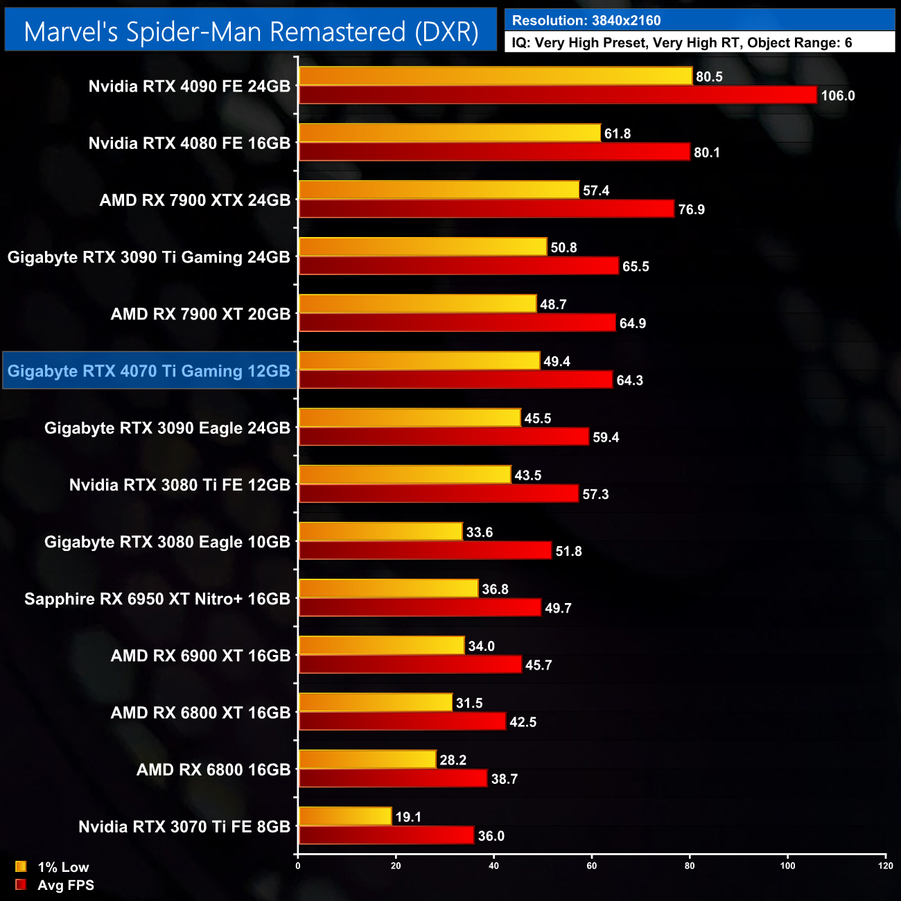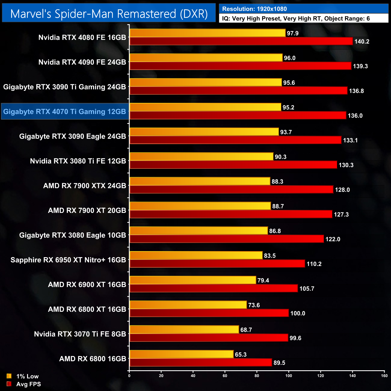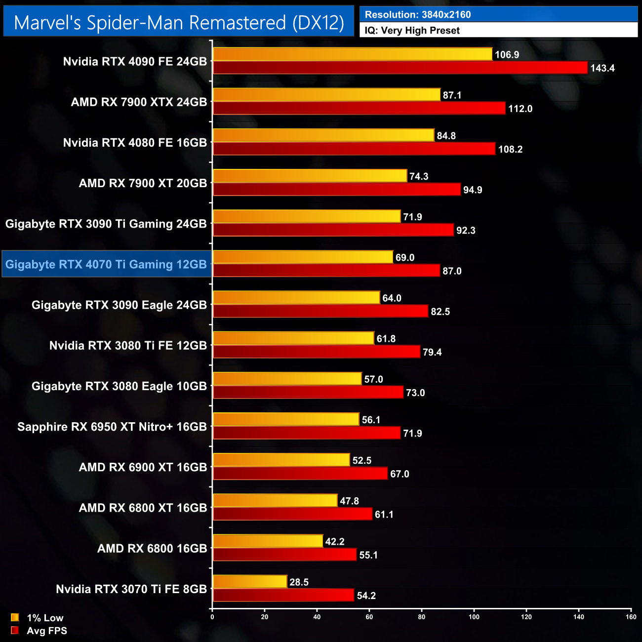 Spider-Man Remastered is more positive for the 4070 Ti though. At 1440p it delivers about 150FPS, making it just 6% slower than the 3090 Ti, and it's within a 10% margin of the 7900 XT.