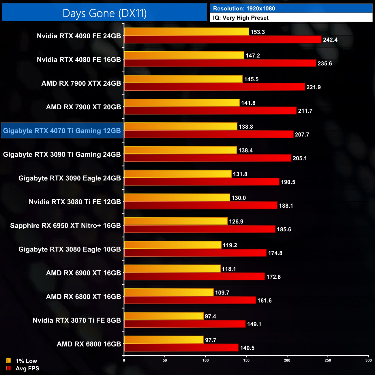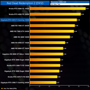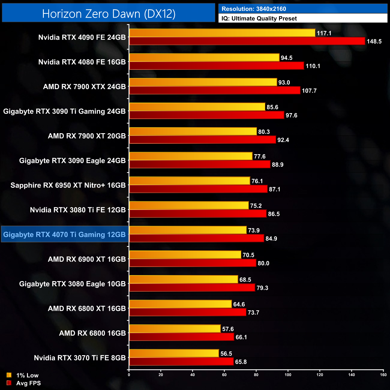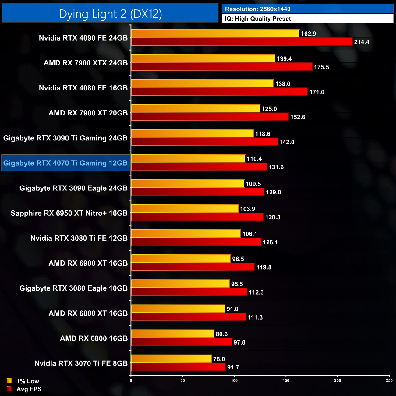 Performance from the RTX 4070 Ti is very strong in Red Dead Redemption 2, at least at 1440p – here it delivers almost 120FPS on average, putting it level with the RTX 3090 Ti and RX 6950 XT.