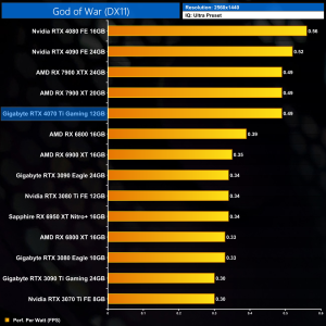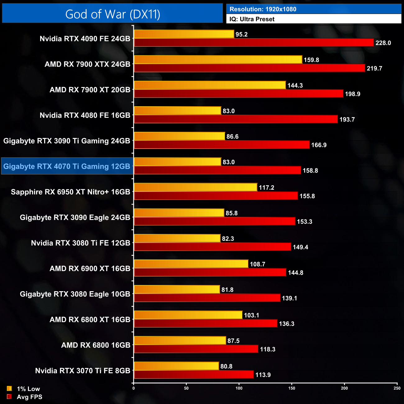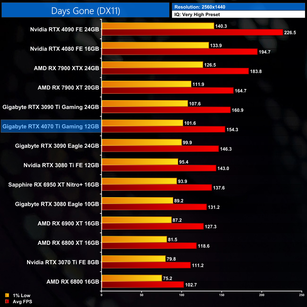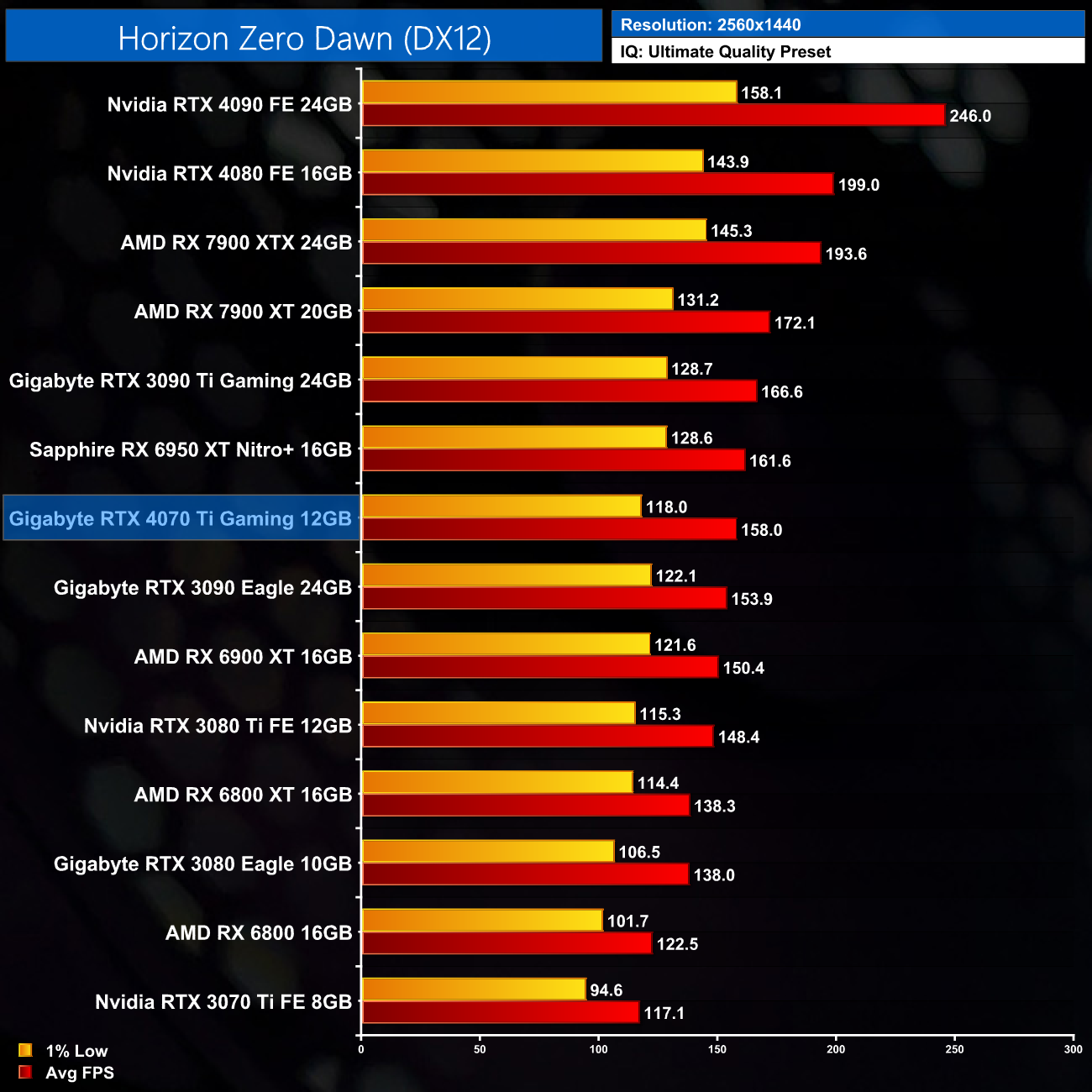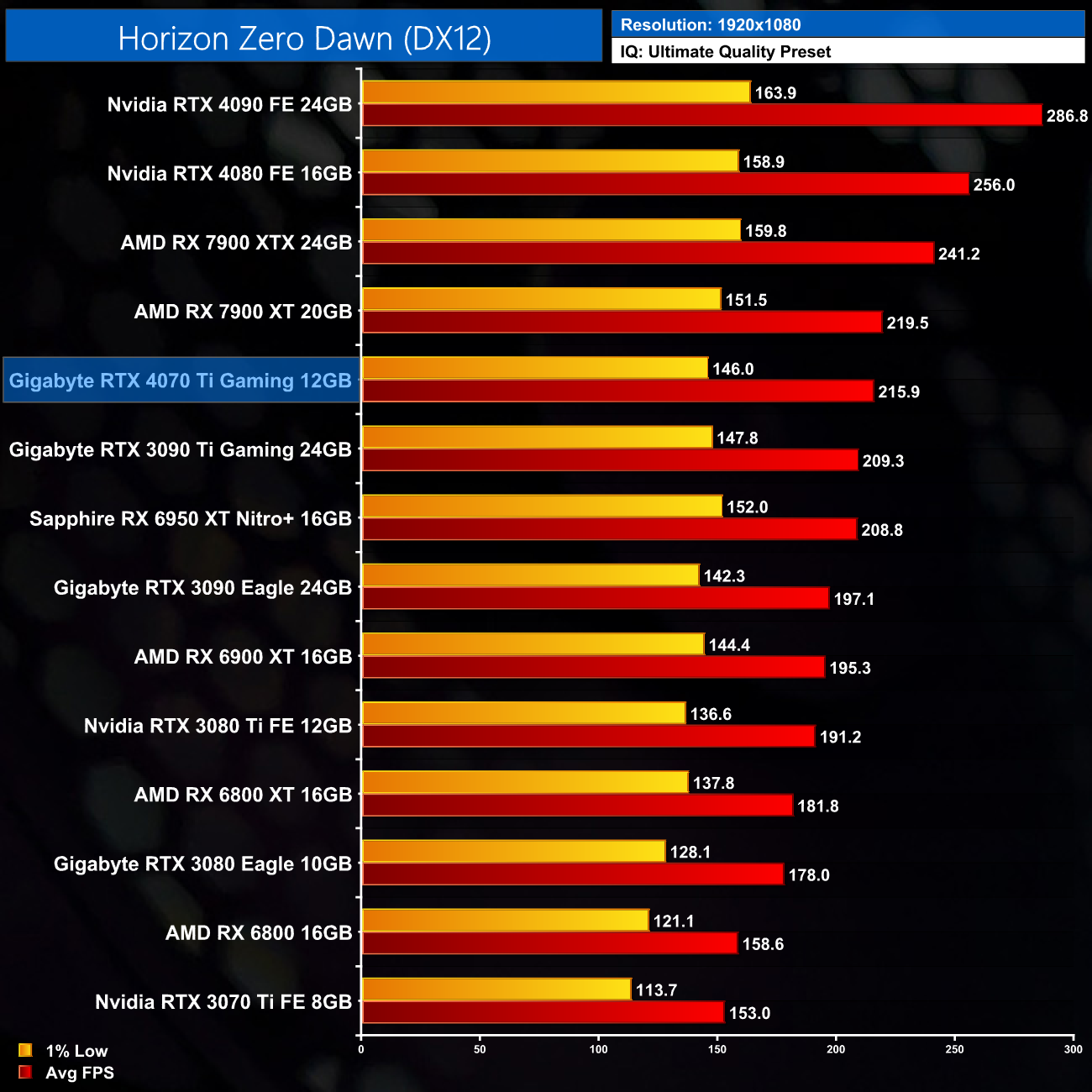 Performance from the RTX 4070 Ti is very strong in Red Dead Redemption 2, at least at 1440p – here it delivers almost 120FPS on average, putting it level with the RTX 3090 Ti and RX 6950 XT.
