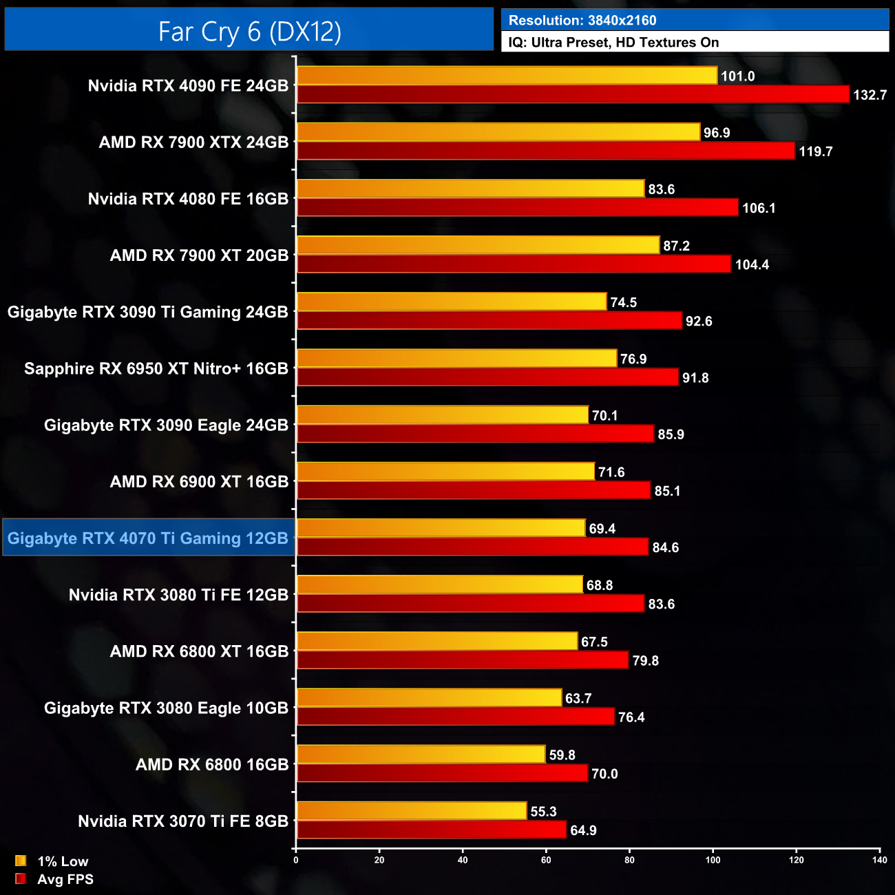 At 4K, the 4070 Ti drops back a touch, where it's 9% slower than the 3090 Ti and 19% behind the RX 7900 XT, though it still averages 120FPS.