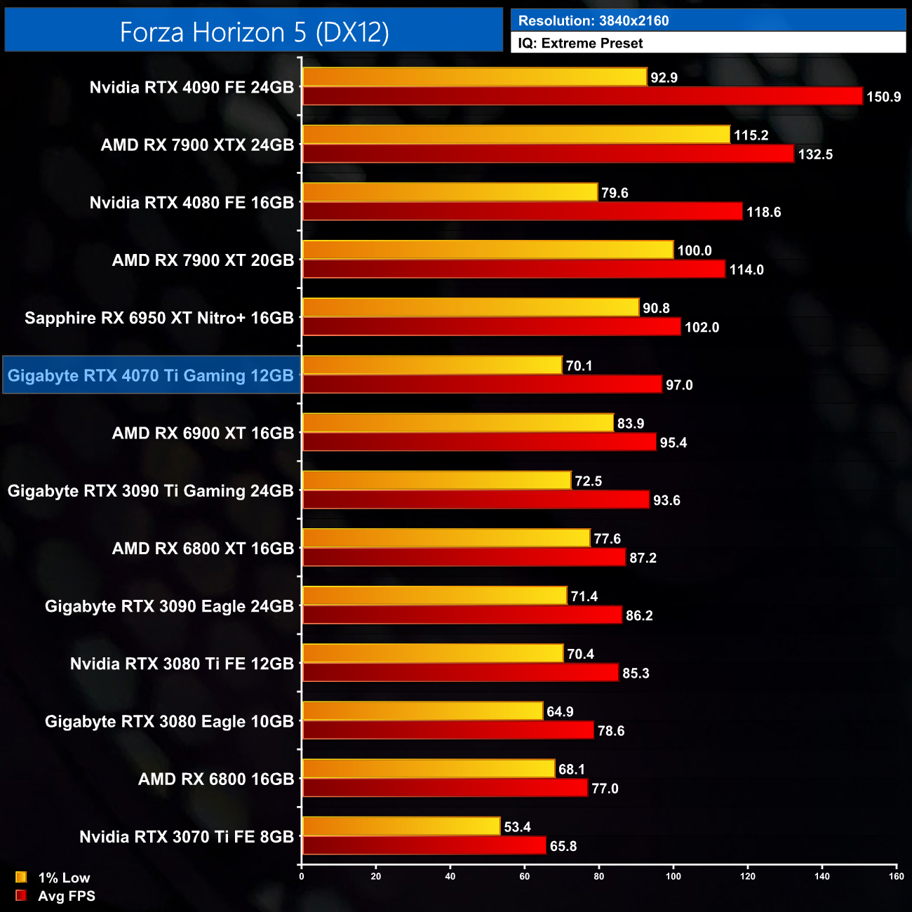 Metro Exodus Enhanced Edition also sees the RTX 4070 Ti edging-out the RX 7900 XTX, though with worse 1% low performance overall.