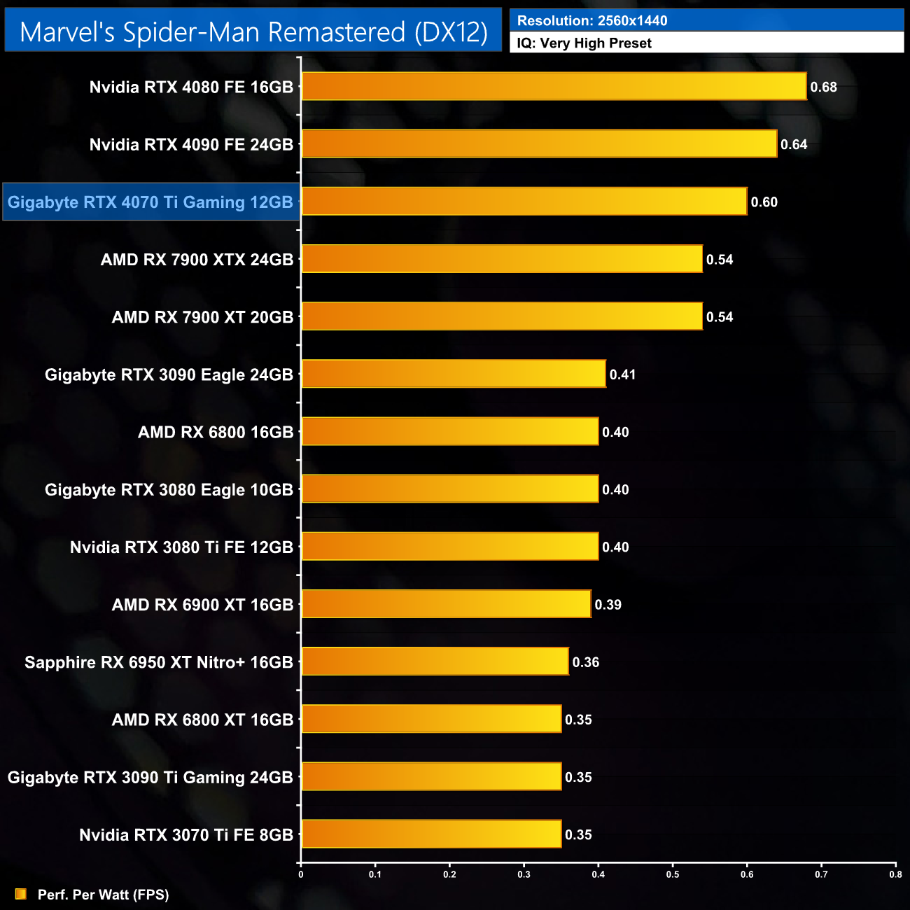 Ray tracing performance scales similarly, too. Granted, you won't be enabling RT Ultra settings at 4K, but even in Cyberpunk 2077 the 4070 Ti was able to average 45FPS at 1440p with the eye candy cranked up to the limit, and that's without touching DLSS. Less demanding ray-traced titles, including Spider-Man Remastered, run significantly better, with performance generally equal to, if not ahead of, the more expensive RX 7900 XT.