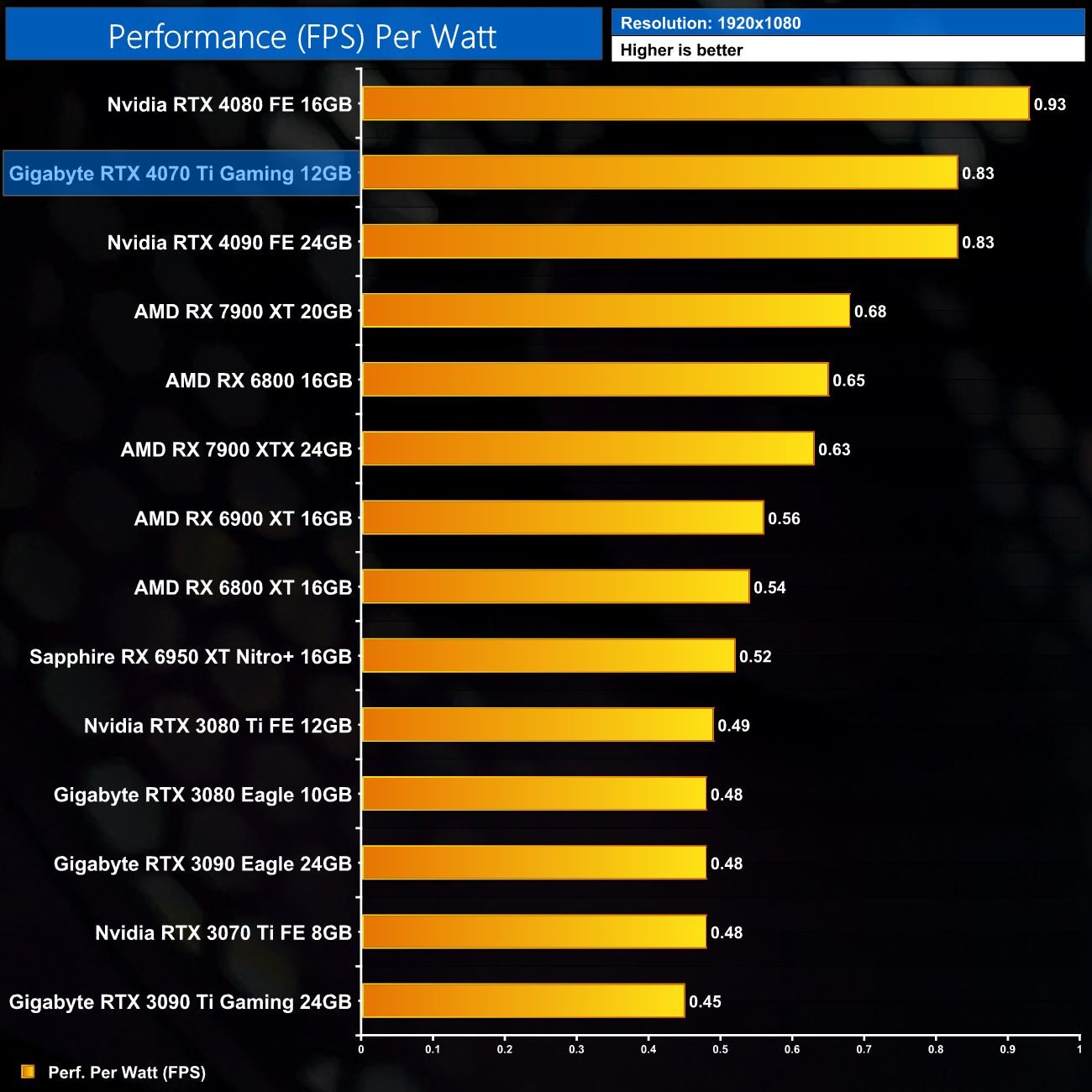 Considering the performance difference between those two cards is fairly wide, at around 20%, the RTX 4070 Ti is actually the least efficient 40-series GPU so far, which is slightly odd given the lower-power SKUs are usually the more efficient. Overall efficiency is not bad by any means and it’s still a good chunk better than the 30-series, but it's slightly concerning that we’re not trending in the right direction as we head down the 40-series stack. For the full set of charts detailing power and efficiency, head to page 28 of this review.