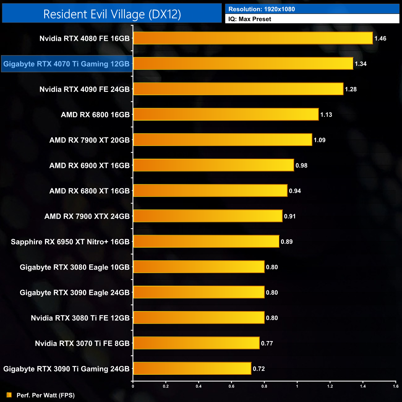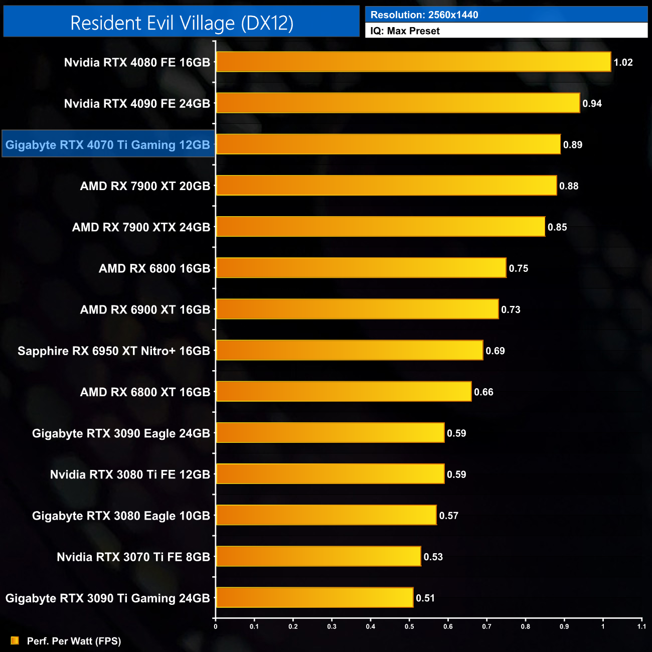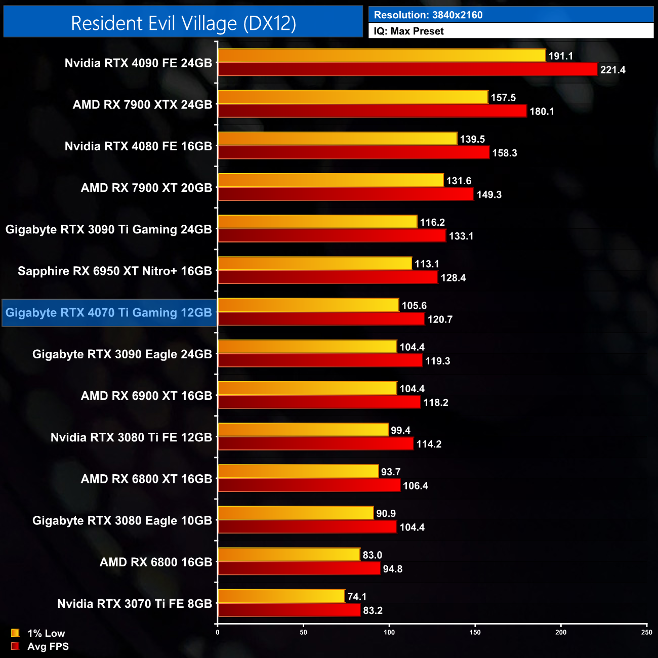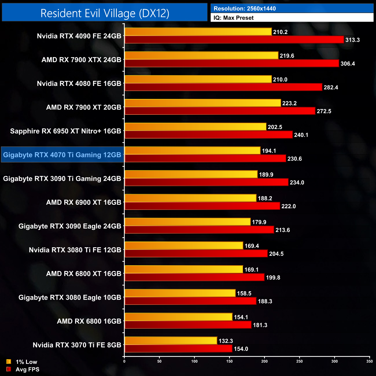 Lastly, for Resident Evil Village and its relatively light ray traced effects, the 4070 Ti is within 4% of the RX 7900 XTX at 1440p, while it's level with the RTX 3090 Ti.