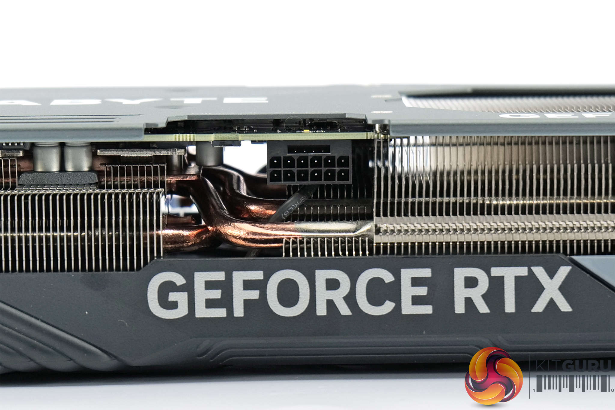 There's also three 100mm fans, using Gigabyte's so-called ‘Unique Blade Fan' design. As expected from a Gigabyte card, the central fan spins in reverse relative to the others, which Gigabyte claims helps to reduce airflow turbulence and therefore increase air pressure down into the heatsink.