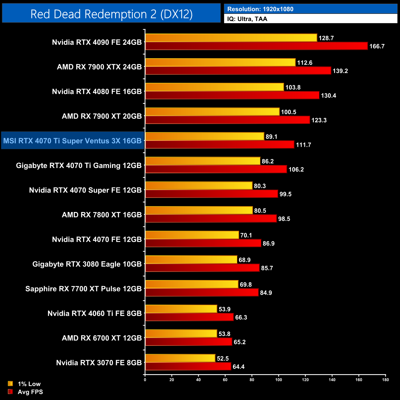 Moving on to Red Dead Redemption 2, with an average of 93FPS, the 4070 Ti Super puts itself 6% ahead of the 4070 Ti, but it still slots in 11% behind the RX 7900 XT.