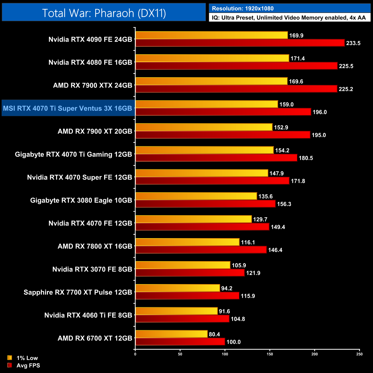 Lastly, we finish off our game benchmarks with Total War: Pharaoh. At 1440p we see one of the bigger leads for the 4070 Ti Super over the card it replaces, to the tune of 14% – I don't think we're running out of VRAM so the increased memory bandwidth is likely the reason for this. It's also one of the very few games where the Ti Super outperforms the 7900 XT.