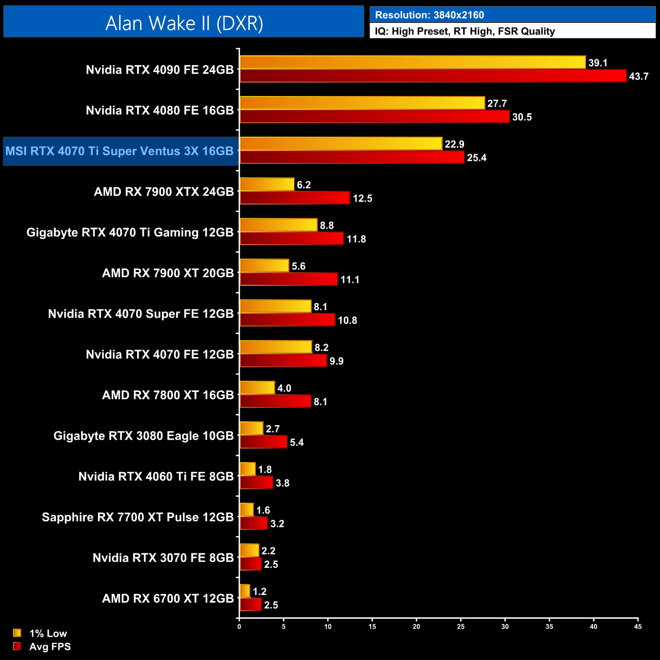 Starting our ray tracing benchmarks with Alan Wake II, here the 4070 Ti Super is the third-fastest card on our chart, averaging 47FPS at 1440p and that actually makes it 17% faster than the 4070 Ti – which is much more like it! It's also over twice as fast as the 7900 XT here.