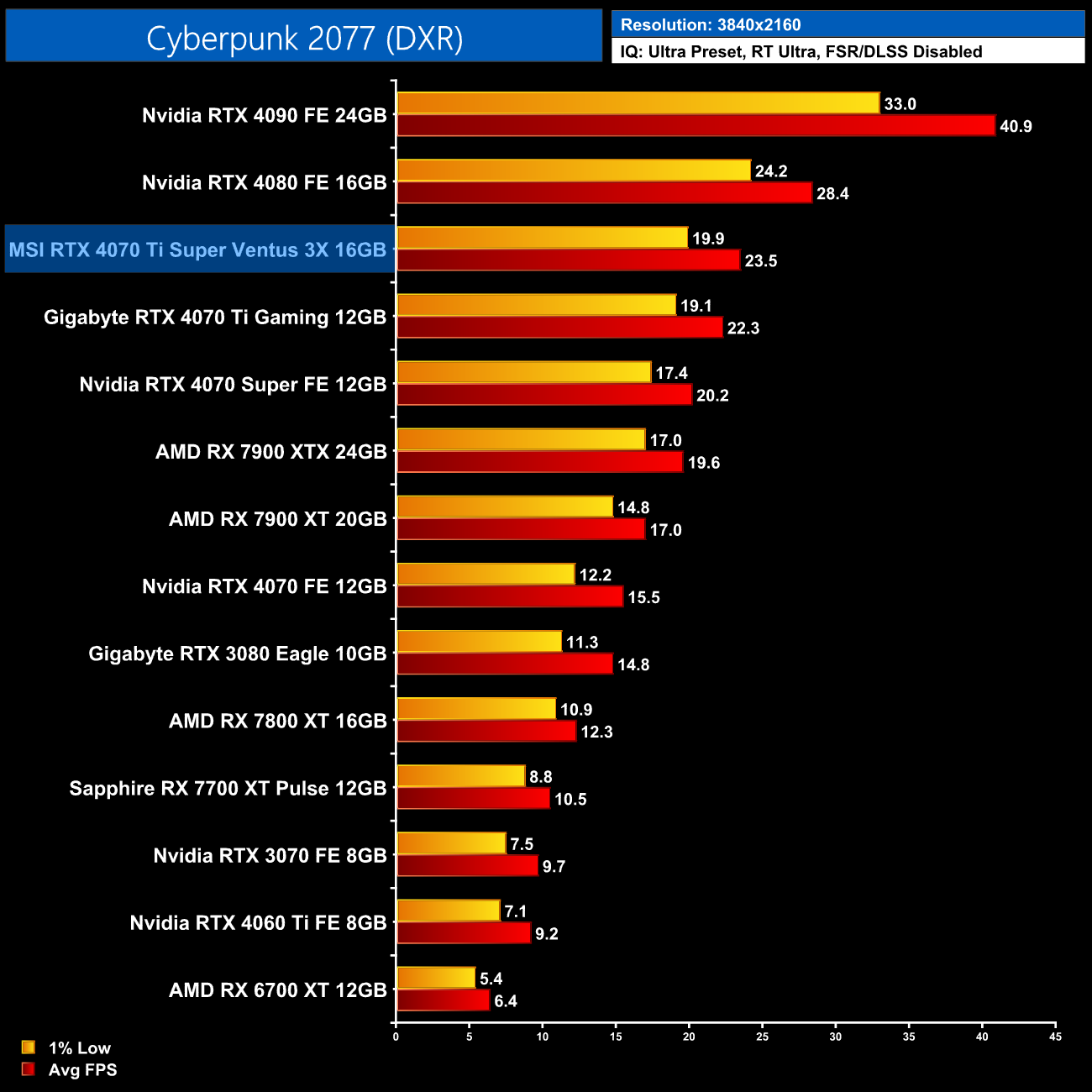 Likewise, In Cyberpunk 2077, we're only looking at a 5% gain for the 4070 Ti Super over the 4070 Ti, while it's 16% slower than the 4080. Nvidia GPUs still crush AMD in this one though, so we're still looking at a 26% lead over the RX 7900 XTX at 1440p.