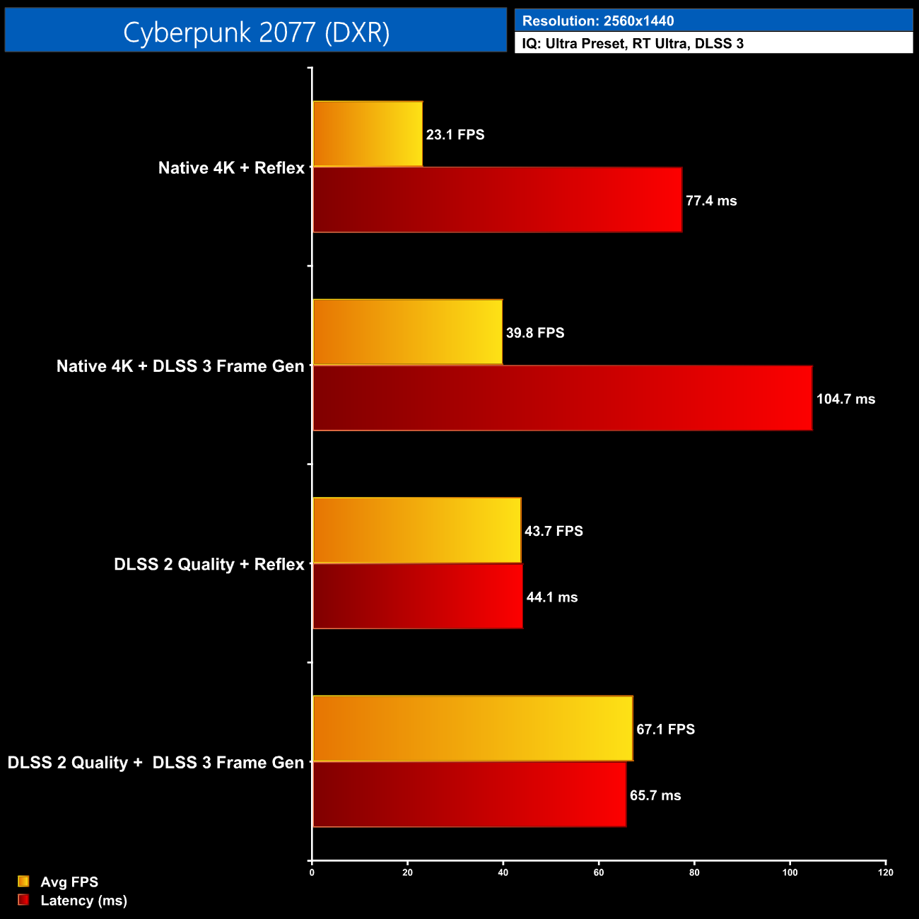 Frame Generation in Cyberpunk 2077 takes the frame rate from 23FPS up to 40FPS, while latency increases from 77ms to 105ms. DLSS 2 Quality mode produces a higher frame rate than Frame Generation alone, with lower latency to boot, but you get the biggest frame rate boost from FG + DLSS 2, hitting 67FPS with 66ms latency.