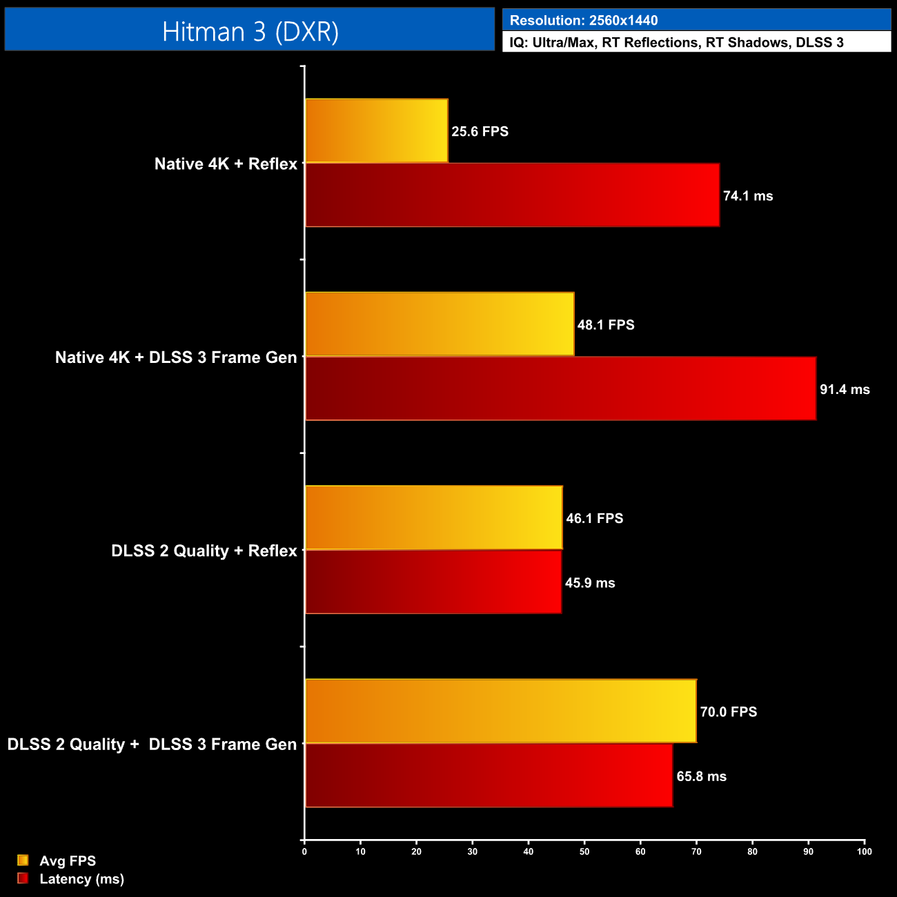 In Hitman 3, we can see almost a doubling of the frame rate when enabling Frame Generation, though latency also increases from 74ms to 91ms. DLSS Super Resolution in its quality mode also boosts FPS to a similar level while cutting latency to 46ms, though DLSS Super Resolution and Frame Generation together can produce 70FPS at 4K, with latency a touch lower than native 4K.