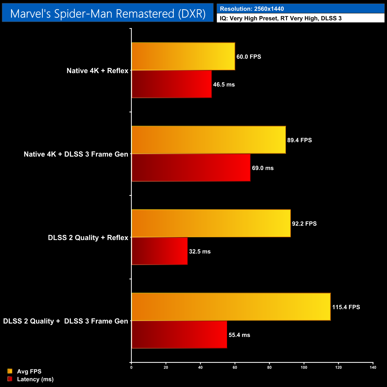 Lastly, Spider-Man Remastered shows a similar trend. DLSS 2 quality and Frame Generation both perform similarly on their own, though FG has higher latency. Use both together and we saw 115FPS average with 55ms latency.