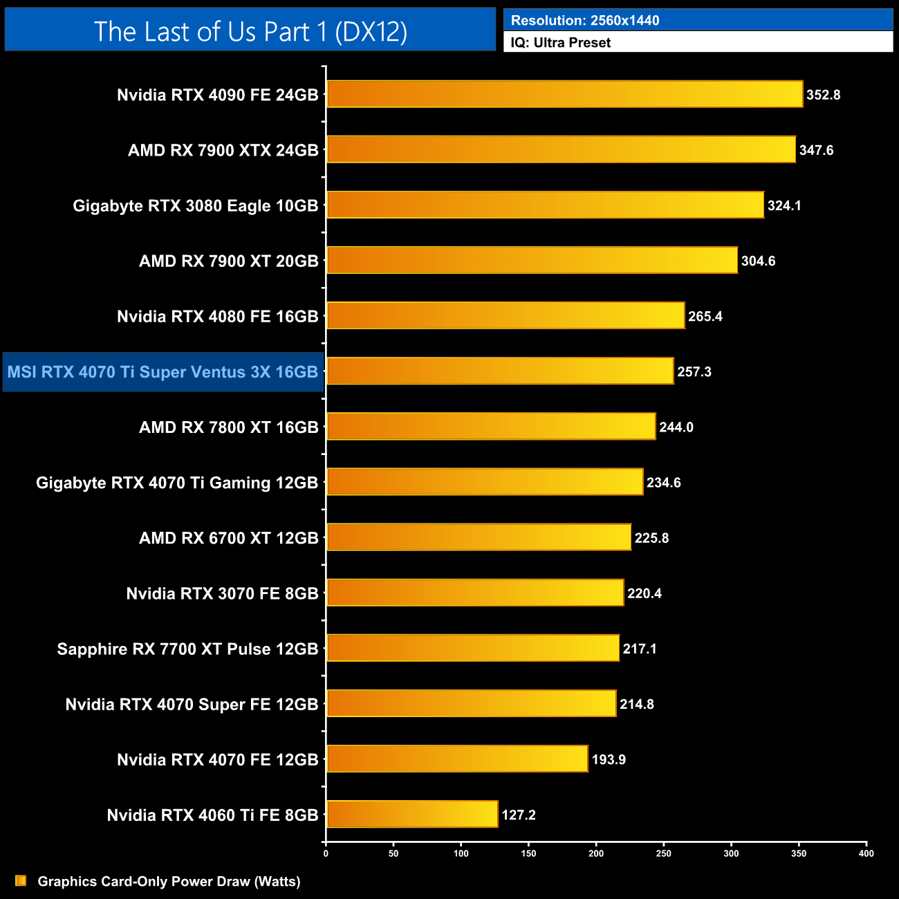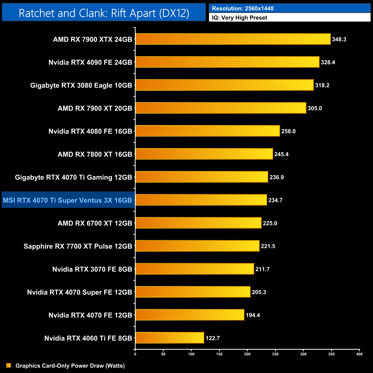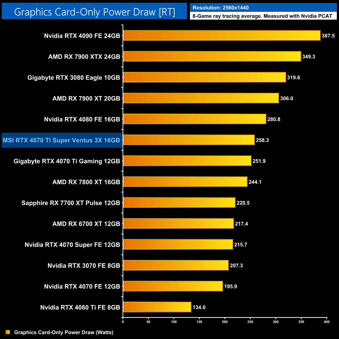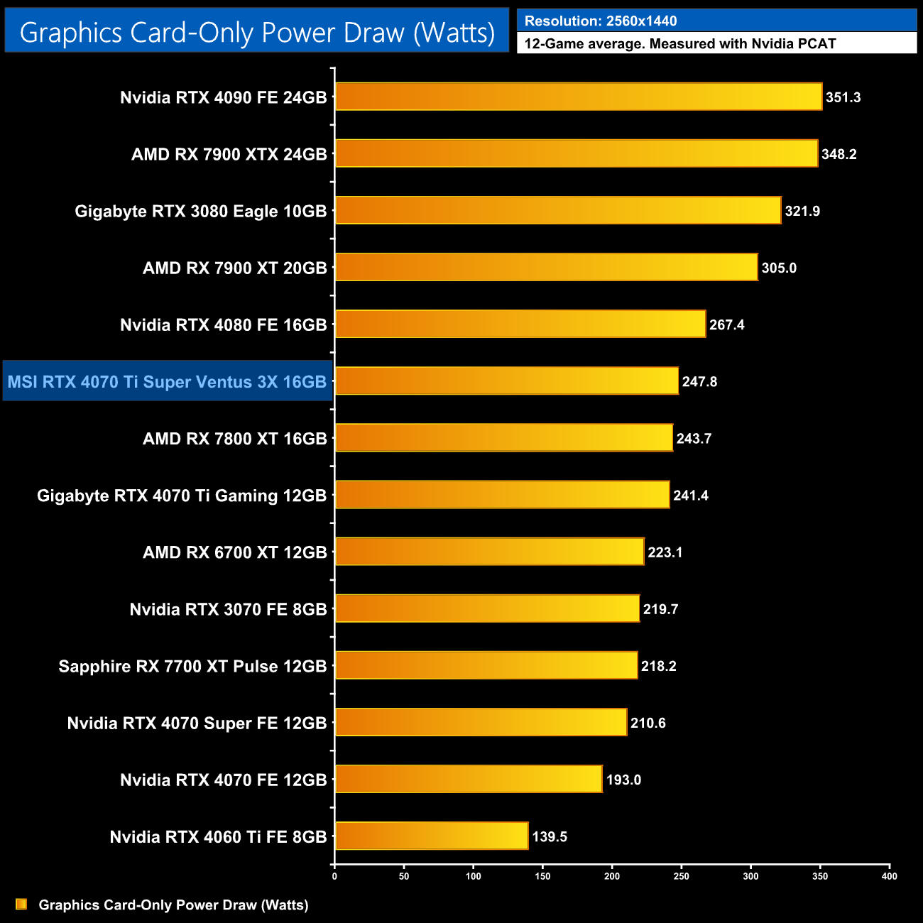 Power draw does increase at 1440p, this time averaging 247.8W. That's just a 6W increase over the original 4070 Ti and is on par with the RX 7800 XT, which gives you an idea about how much more efficient Ada Lovelace GPUs are compared to their RDNA 3 rivals.