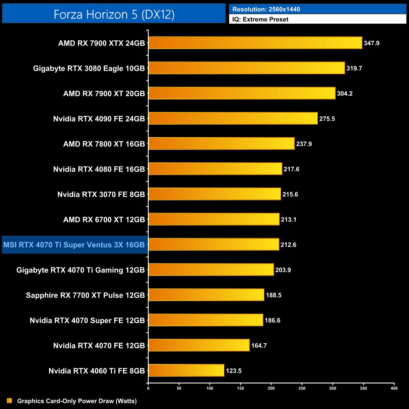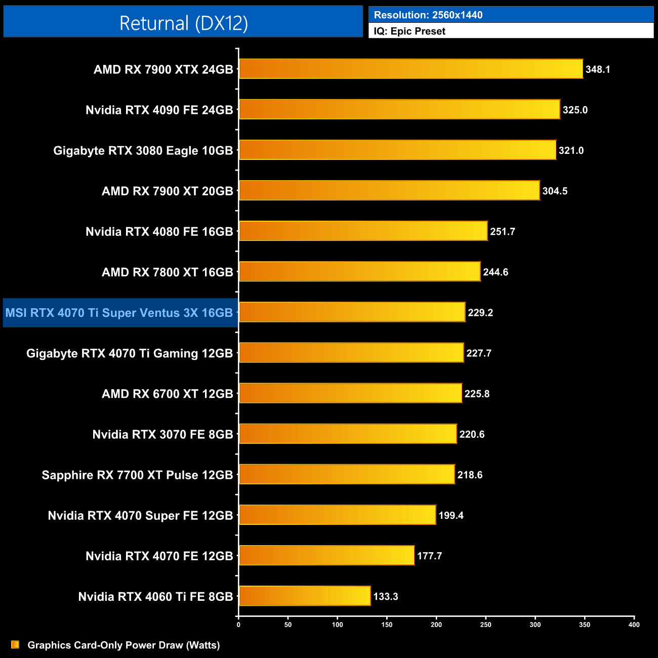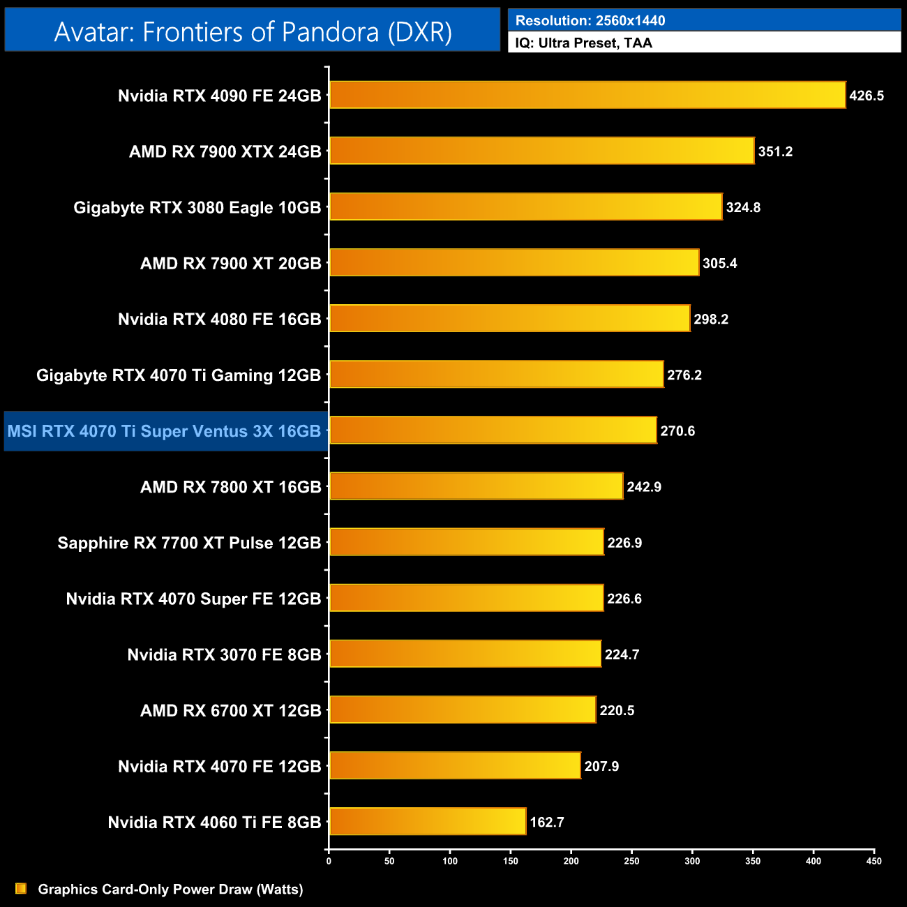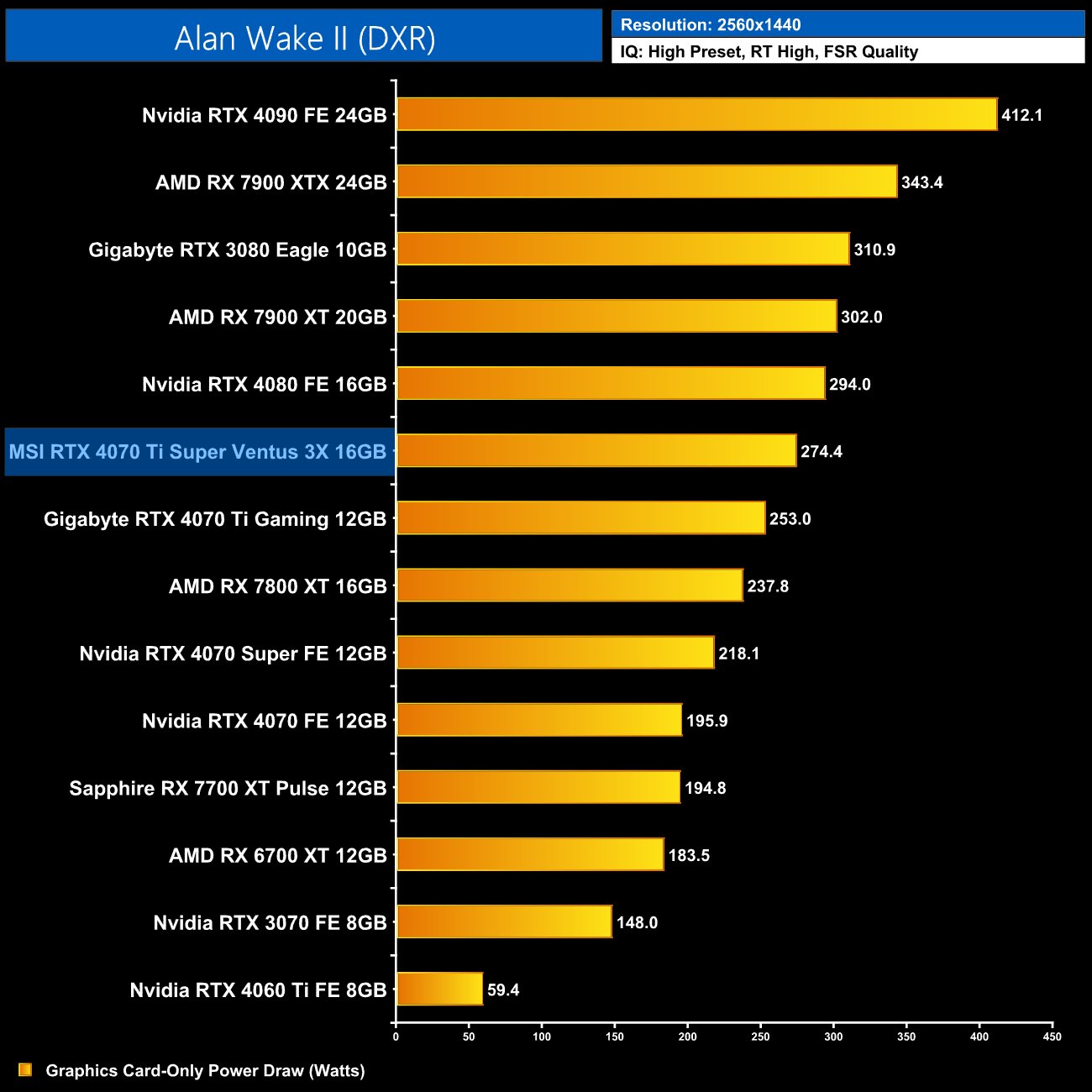 Power draw does increase at 1440p, this time averaging 247.8W. That's just a 6W increase over the original 4070 Ti and is on par with the RX 7800 XT, which gives you an idea about how much more efficient Ada Lovelace GPUs are compared to their RDNA 3 rivals.