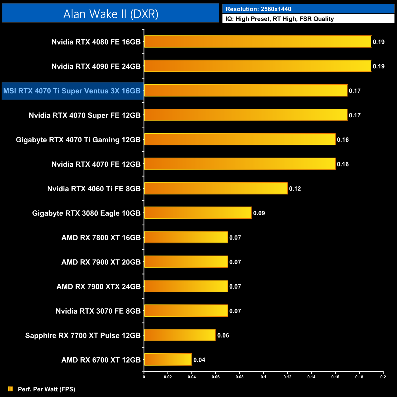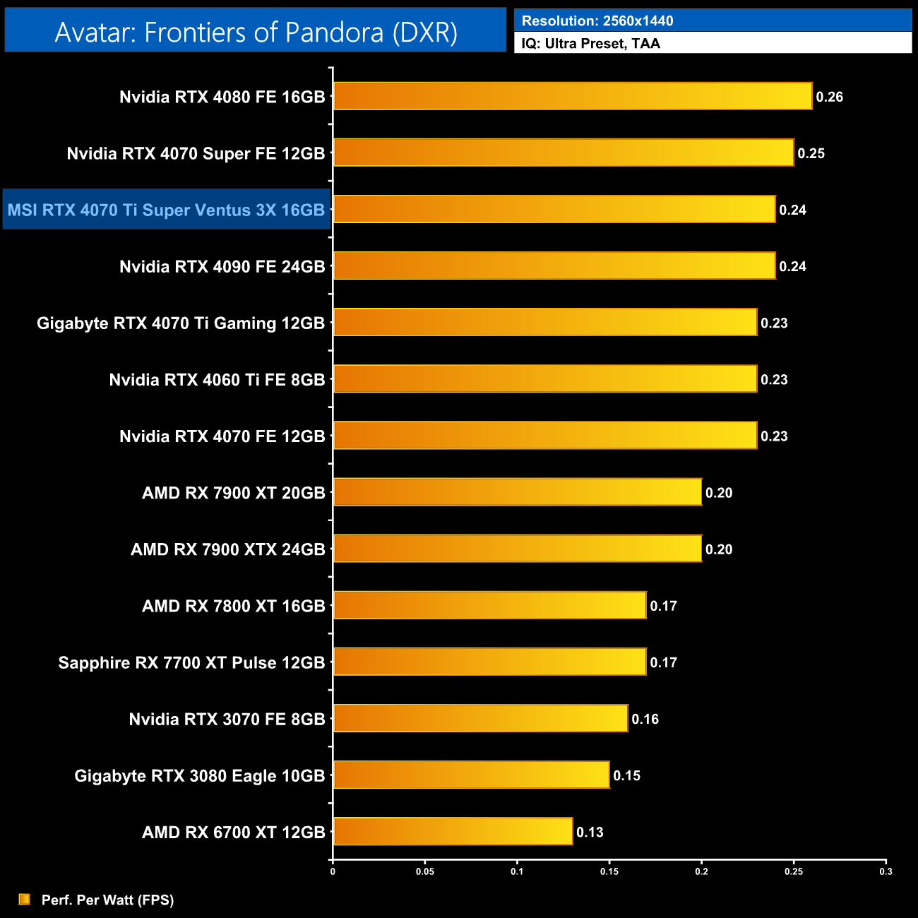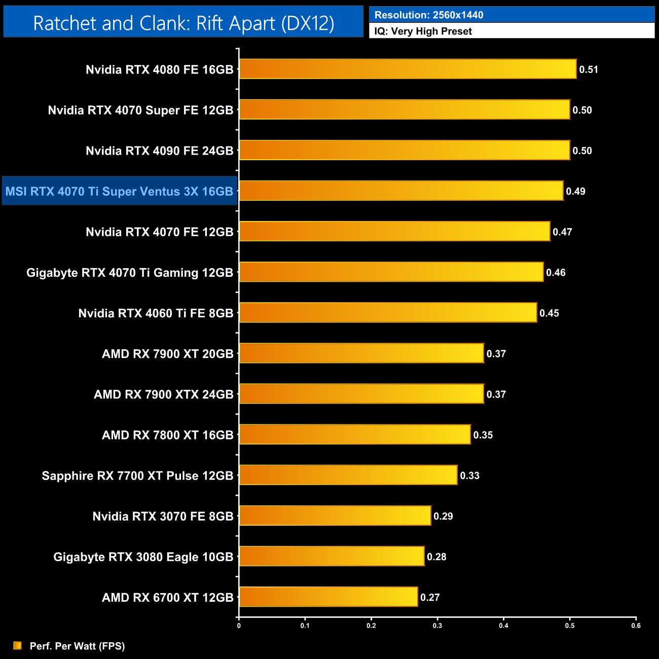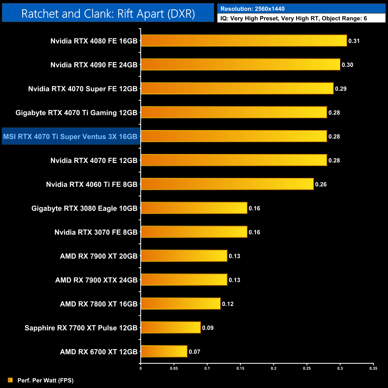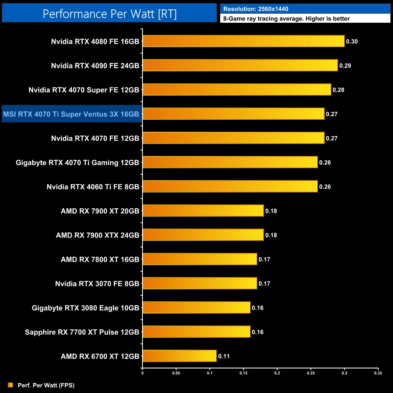 As for 1440p, here we can see the 4070 Ti Super is still delivering very similar efficiency to the other RTX 40-series GPUs. It does offer 5% better performance per Watt than the 4070 Ti, but the real win is against AMD, where the Ti Super is 16% more efficient than the RX 7900 XT.