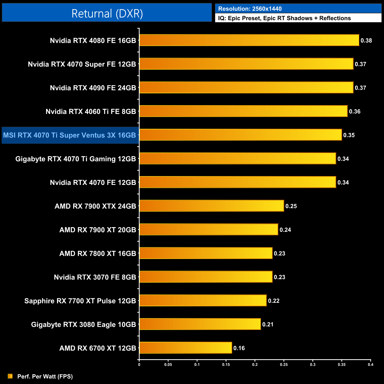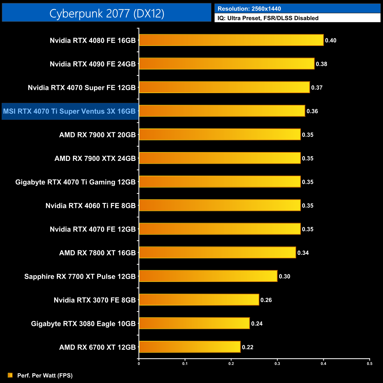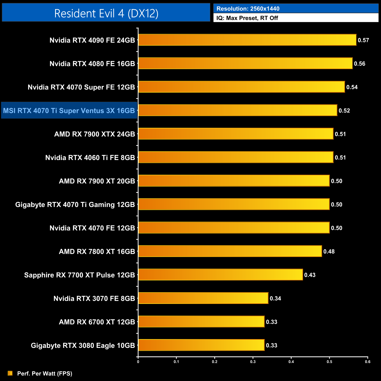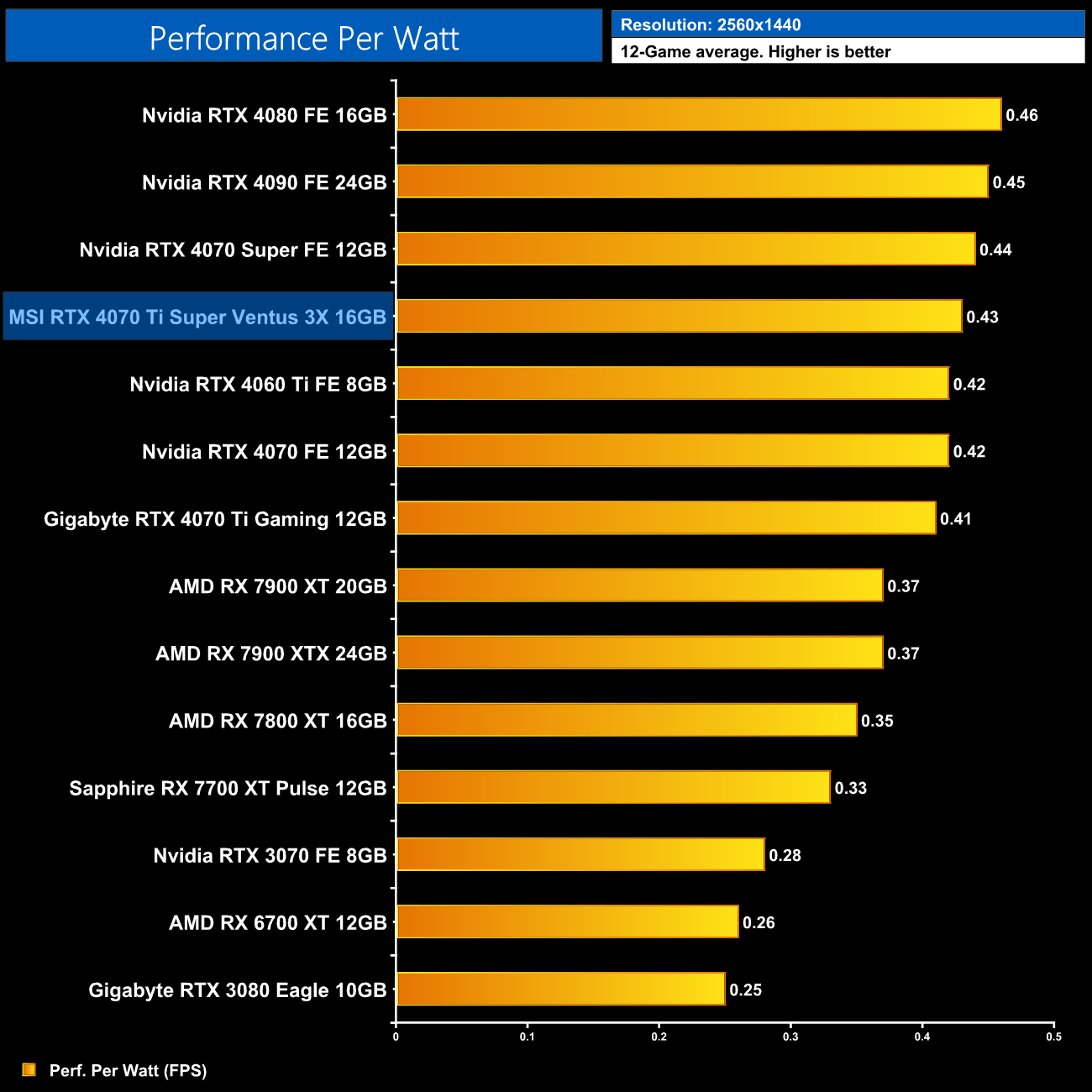 As for 1440p, here we can see the 4070 Ti Super is still delivering very similar efficiency to the other RTX 40-series GPUs. It does offer 5% better performance per Watt than the 4070 Ti, but the real win is against AMD, where the Ti Super is 16% more efficient than the RX 7900 XT.